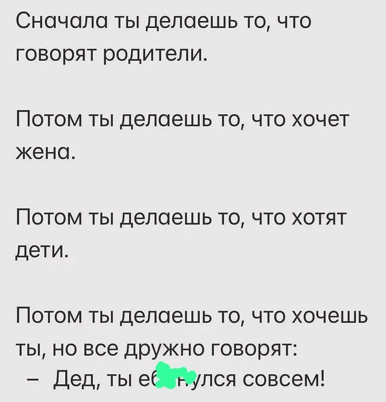 11 zavodnoyapelsin0 Жизненный путь настоящего мужчины 2 месяца назад План жизни: ✅Угодить родителям ✅Угодить жене ✅Угодить детям ❌Быть собой -- ошибка системы Жизнь Грустный юмор Юмор Мемы Картинки Картинка с текстом Ожидание и реальность Жизненно 3 1 Ещё 0
