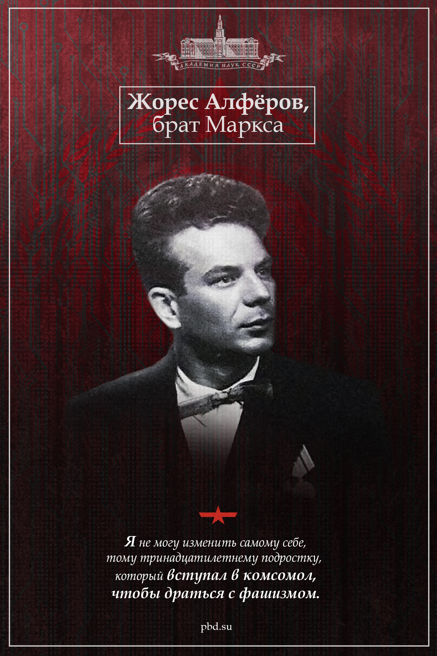 Жорес Иванович был одним из них — ярчайших детей Октября, в котором спустя и сотню лет отражалось величие большой и светлой мечты о единстве мира, веры в то, что над человечеством когда-то засияет звезда, которая заставит нас взглянуть на небо. «Кухаркин сын», по странной насмешке судьбы именно он, Жорес, брат Маркса, родившийся на стыке эпох, заставший становление, возмужание молодой советской республики застал и её закат, крах, смерть. Его отец был делегатом Второго Съезда Советов, брат погиб в 1944-ом, в последние дни Корсунь-Шевченковской битвы, а он сам — спустя пару десятилетий совершил революцию в сфере полупроводников — из его открытия потом вырастет полупроводниковый лазер — отец интернета, телефонной связи, и многого другого.