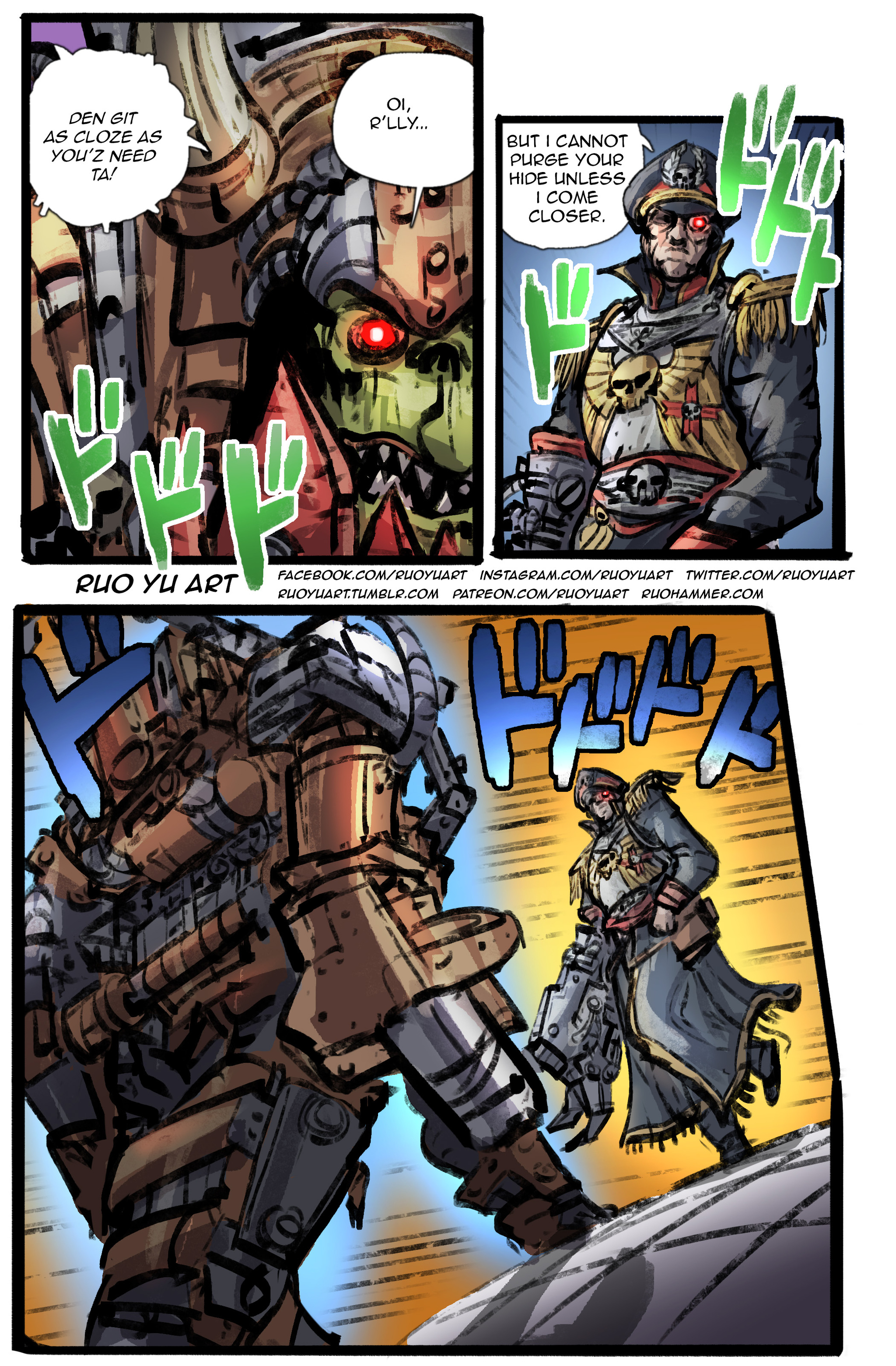 Орк: "Тогда подойди так близко, как тебе нужно!""О, правда..." Комиссар: "Но я не могу содрать твою шкуру, пока не подойду ближе." Идут навстречу друг другу