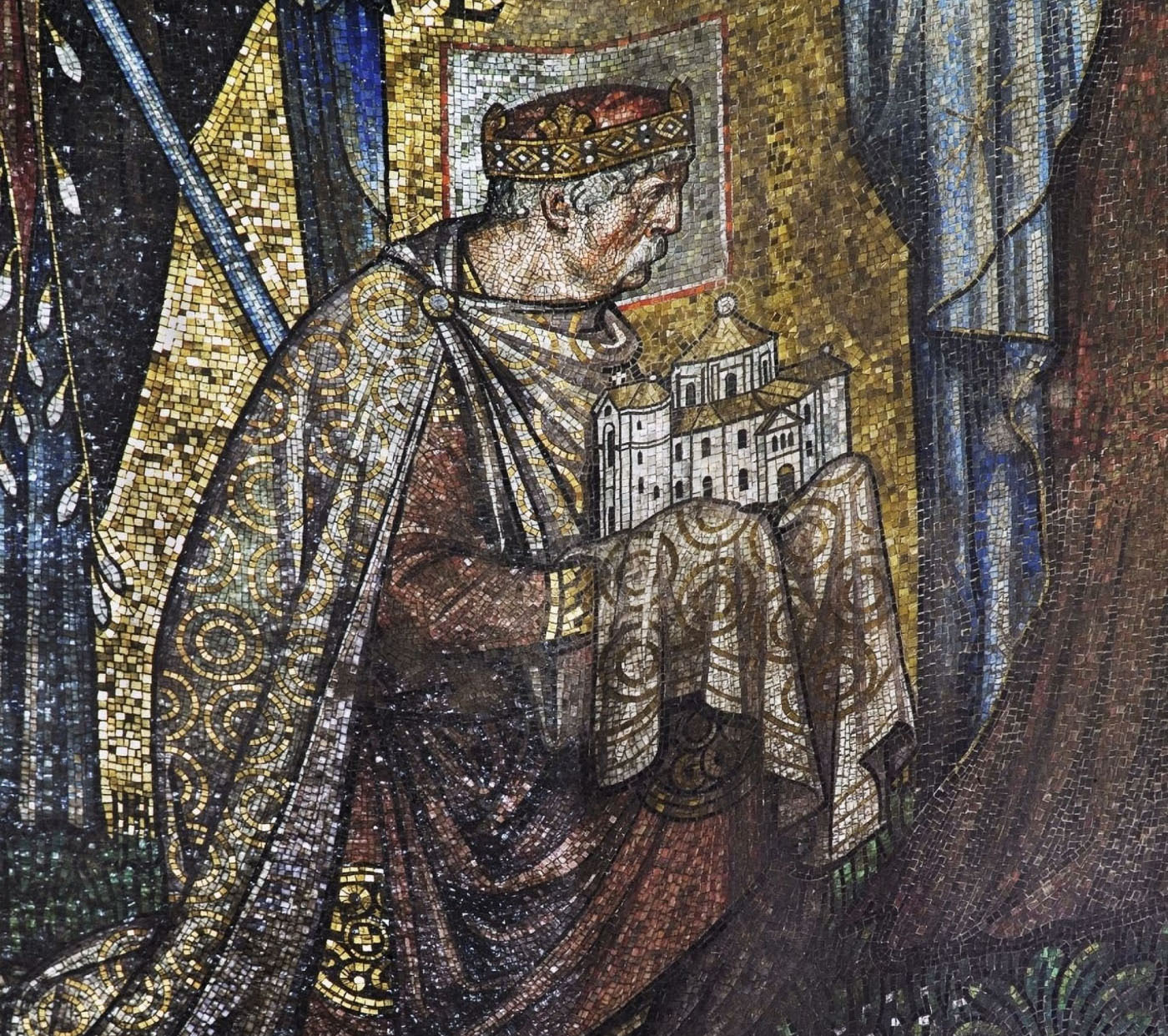Гарда выполнена в виде креста, покрыта золотом, и имеет довольно большие размеры. Первоначальная гарда этого меча, вероятно, не имела такого внешнего вида. Ширина этой части меча составляет 22 см, что довольно много. На концах изображены драконы с глазами из лазурита. В 1300-х годах к нему был добавлен крест, на котором был оттиснут вес золота рукояти меча.