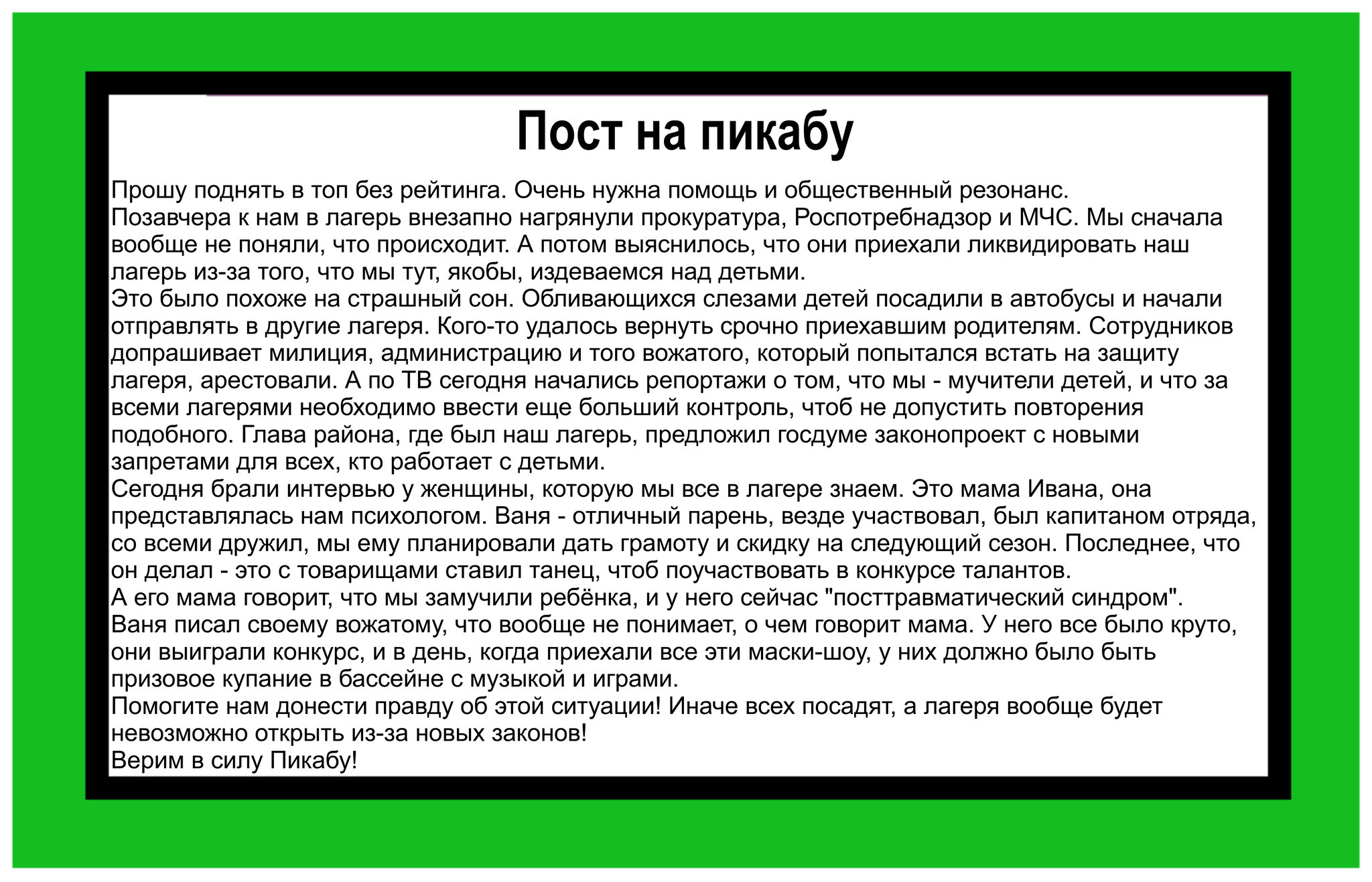 28 StrategT.A Журналистика в простых примерах 5 лет назад Переработанная "под лагерь" классика. Все совпадения не случайны. [моё] Картинки Детский лагерь Журналистика Сарказм Картинка с текстом Длиннопост Ещё 0