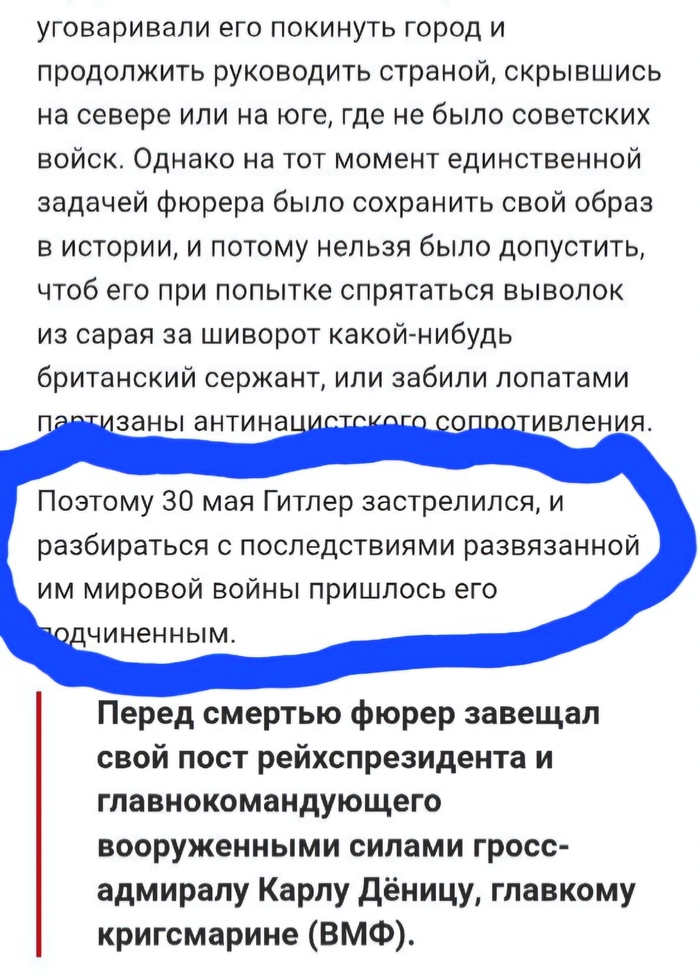 «Гитлер застрелился 30 мая 1945 года». Ну, всё, пожалуй, на этом закончим.