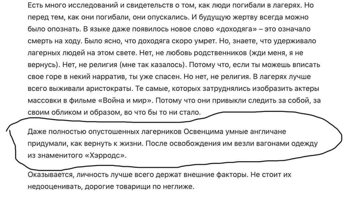 «Англичане привезли в 1945 году освобождённый ими Освенцим (!) брендовую одежду из люксового универмага «Хэрродс», и раздавали узникам». По итогу оказалось: автор слышал звон, да не знает, где он – это было в концлагере Берген-Бельзен, и британцы раздавали изъятые у немцев «секонд-хэнд» вещи, в шутку прозвав свой пункт «Хэрродс». После моего издевательского поста не последовало никаких извинений – помпезную статью поспешно переправили. Автор – человек с высшим образованием, не был в курсе - кто освободил Освенцим?