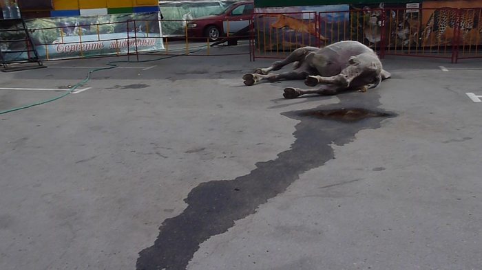 Прямо посреди зоопарка на асфальте без движения лежит крохотный жеребёнок, а неподалёку от него в луже собственных отходов жизнедеятельности "отдыхает" верблюд, которого сначала можно принять за мёртвого.