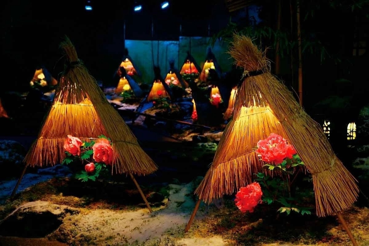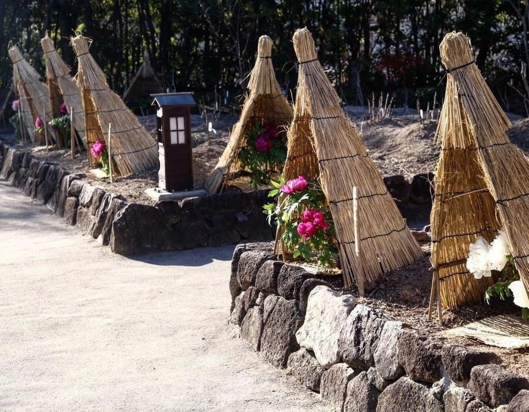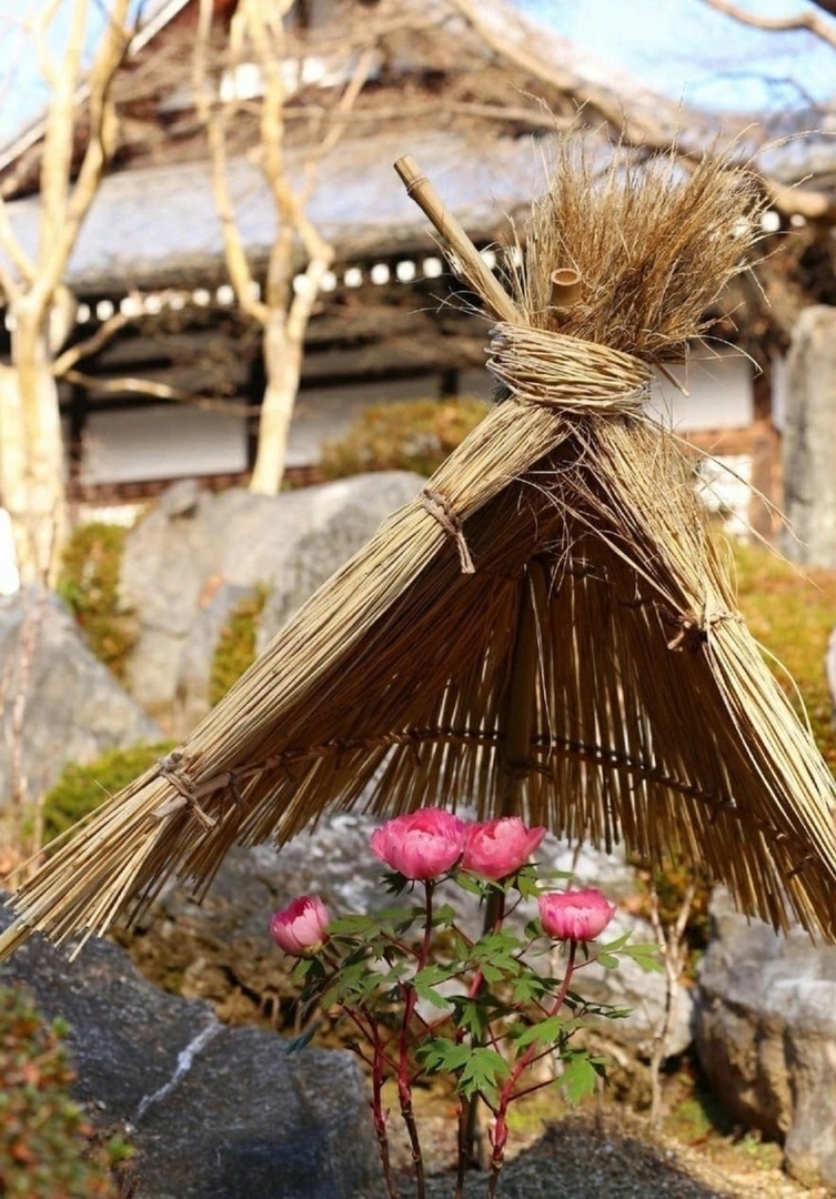 Нежные бутоны пионов и пушистый снег — удивительное сочетание, а защитные плащики из соломы - варабоши わらぼうし ( わら帽子 ), только добавляют очарования…