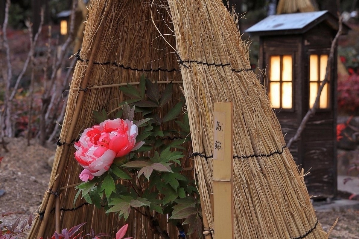 Японские пионы цветут даже под снегом ! Главное – прикрыть нежные цветы соломенными накидками, чтобы тяжёлые хлопья снега не поломали бутоны.