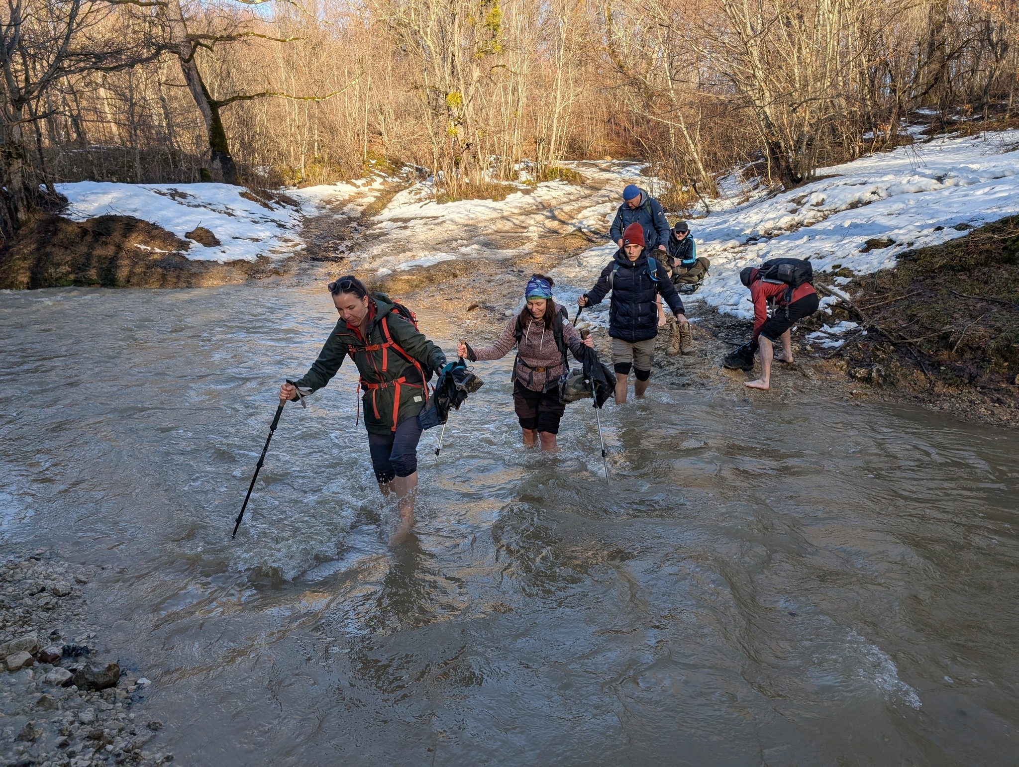 Там речка разлилась и пришлось разуться, показали как ходить броды. Всё прошло хорошо и ушли через зимний лес на смотровые.