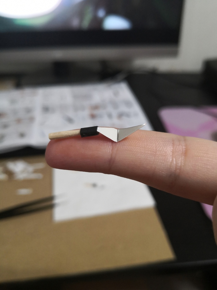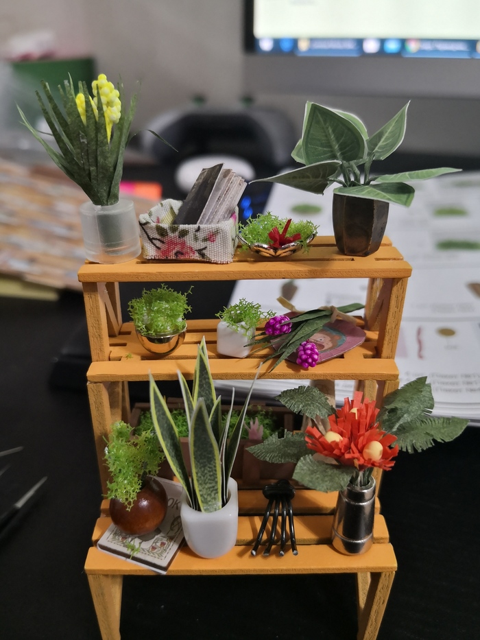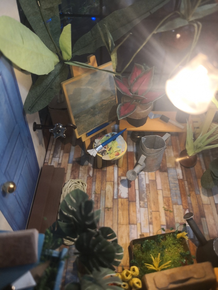 Все детали сделаны вручную, кроме деревянных - они склеены из маленьких деревянных. От лампочки провода уходят вниз под основание, с помощью мини-пульта можно вкл/выкл свет. Маркер для масштаба.