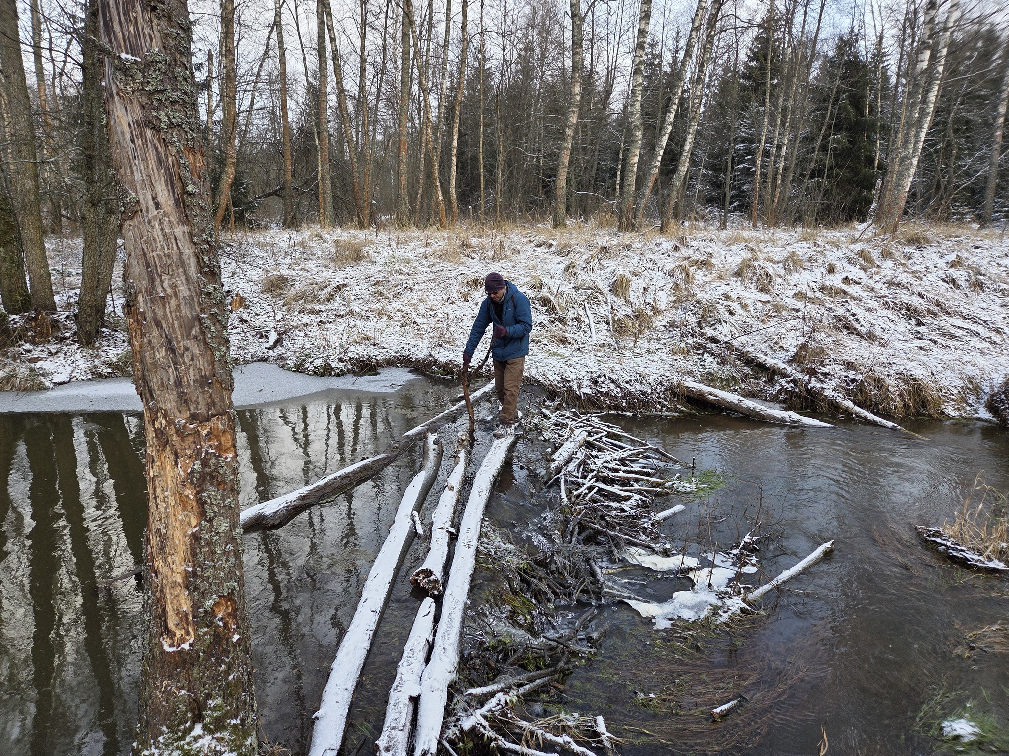 В 11:12 приходим на 43 кп одними из первых или вообще первыми, следов мы не видели. Основная масса народу ушла на более длинные дистанции, стартовавших рано участников короткой дистанции немного. Уверенно лежит только одно бревно, брёвна что лежат левее плавают в воде, стрёмно. Неподалёку находим упавшее дерево и отламываем от него ветки чтобы использовать как шесты. Пока мы возимся с шестами прибегает участник налегке который просто берёт и почти перебегает, основательно намочив при этом ногу.