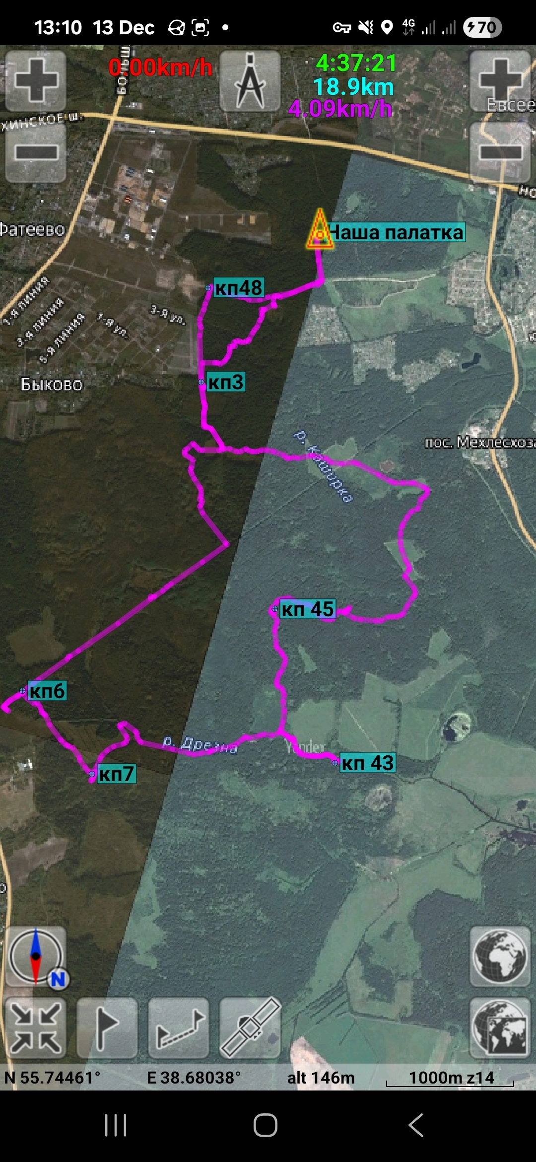 Навигация осуществлялась в программе SaS4Android по предварительно выкачанным спутниковым снимкам с Яндекс гибридом до 18 масштаба.