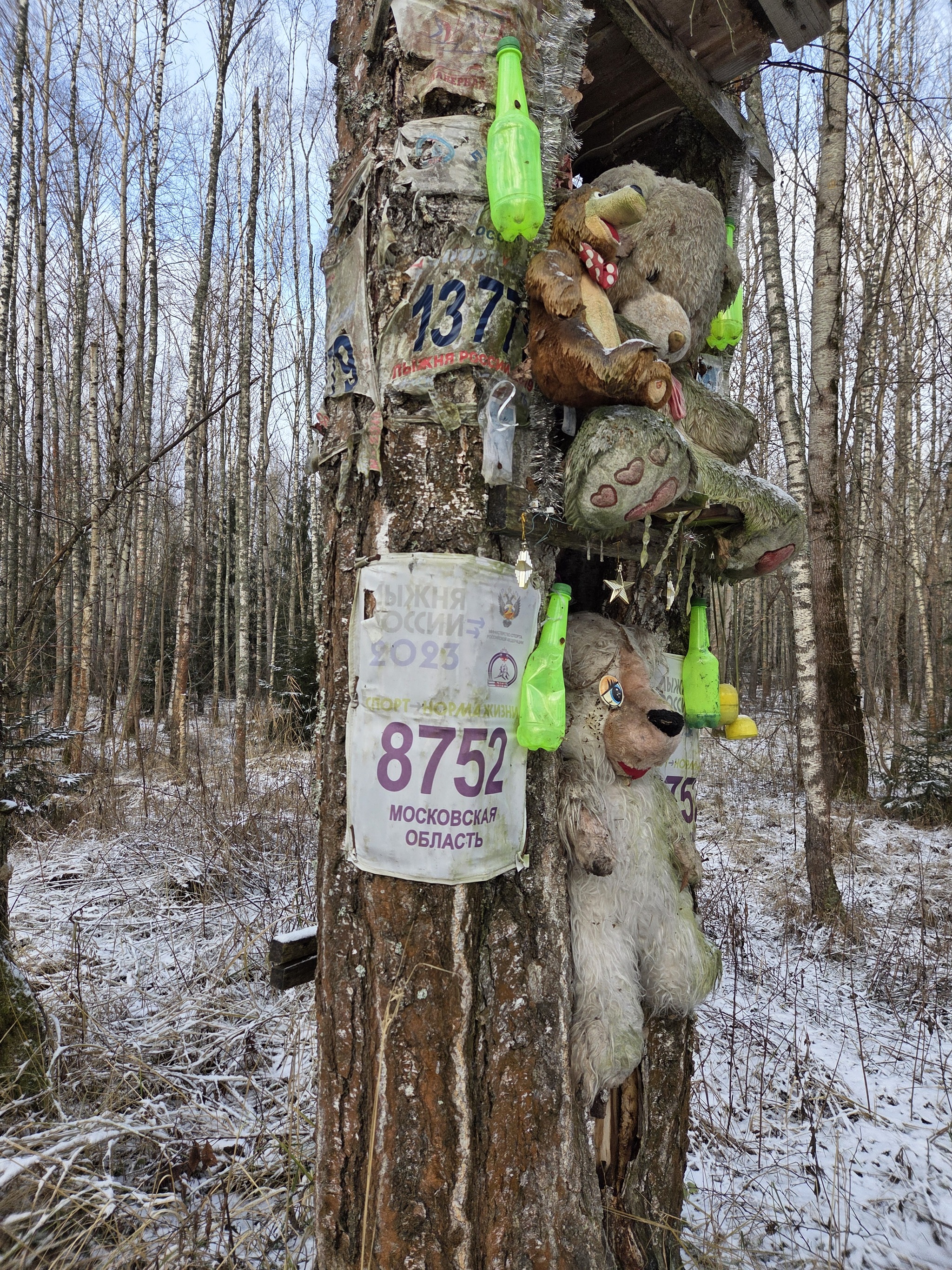 Не понравилось как Лыжня России замусоривает лес, огромные листы и майки с рекламой варварски вкрученные на саморезы в живые деревья.