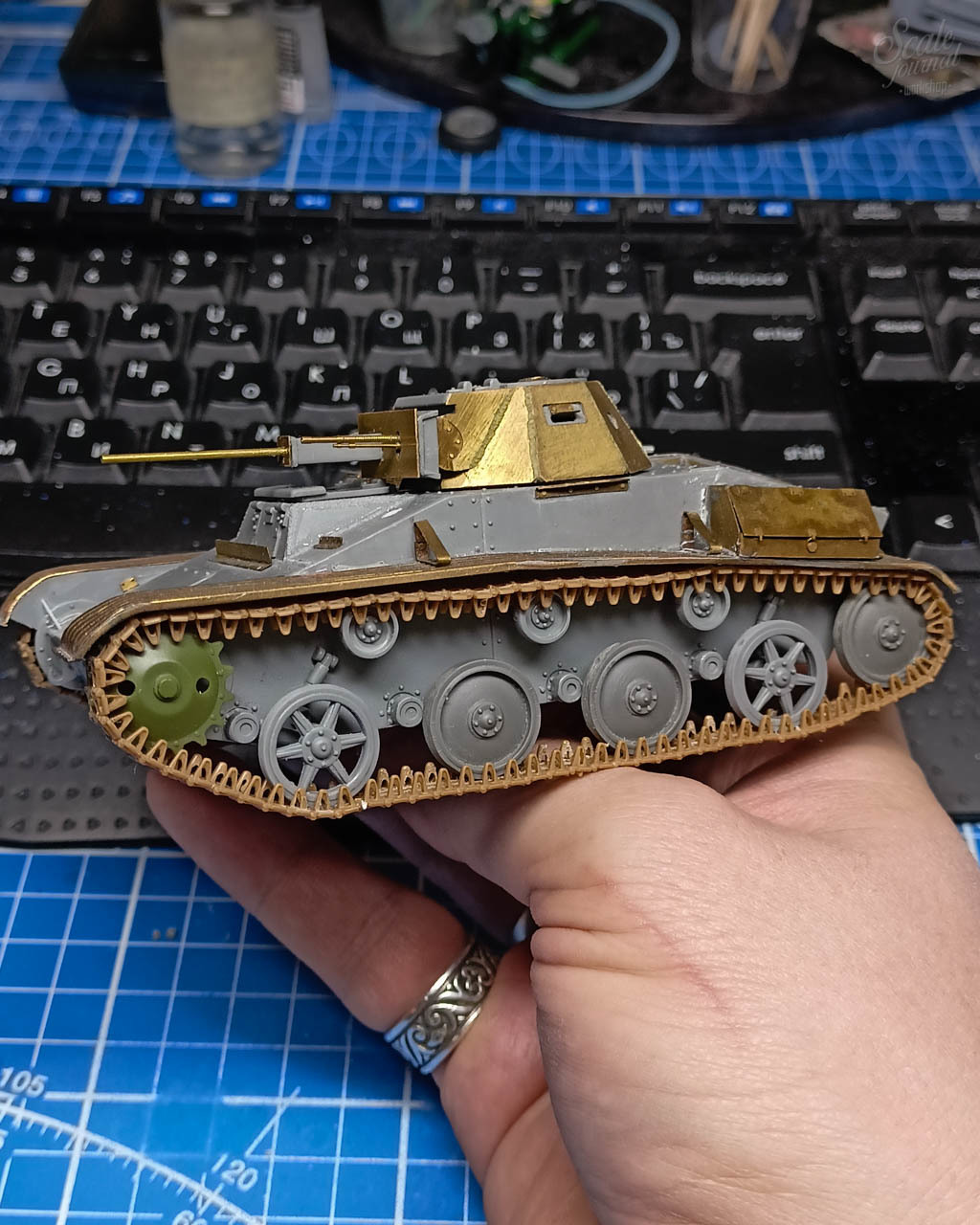 Вопрос с гусеницами закрыт. Всё сразу приклеил на свои места и красить буду в сборе. На этом фото можно обратить внимание на то что катки разные. Делал опираясь на архивные фото. Попадались такие образцы с разными катками