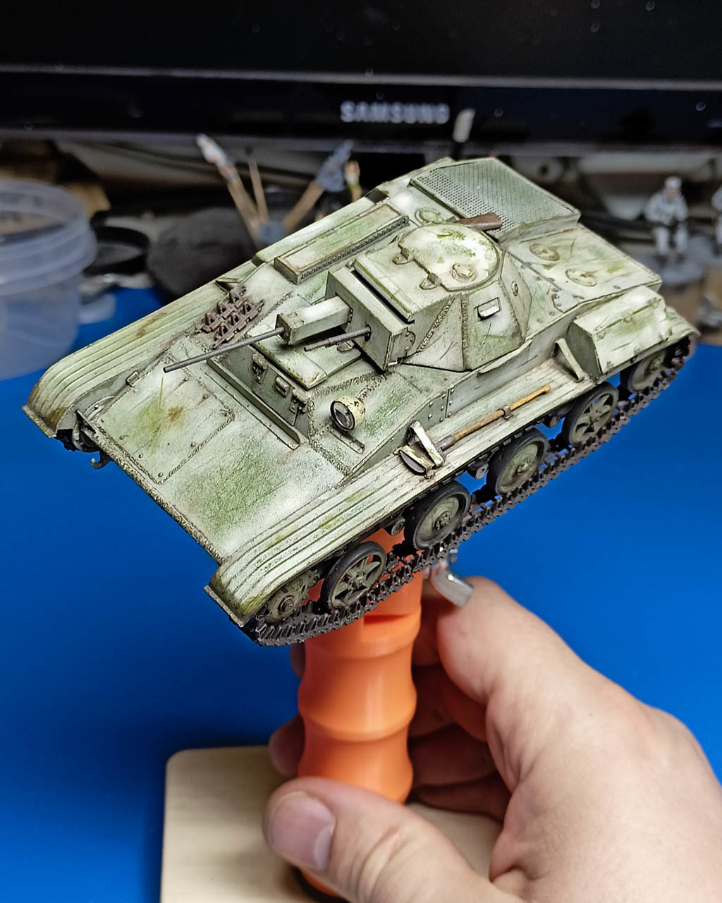 Выкрасил мелочевку, катки и траки кистью красками Pacific88. Сделал смывку, использовал коричневую от Tamiya. Добавил потеки c помощью масляных красок Wilder и покрыл модель матовым лаком от Tamiya. Готовность Т-60 примерно на 90%.