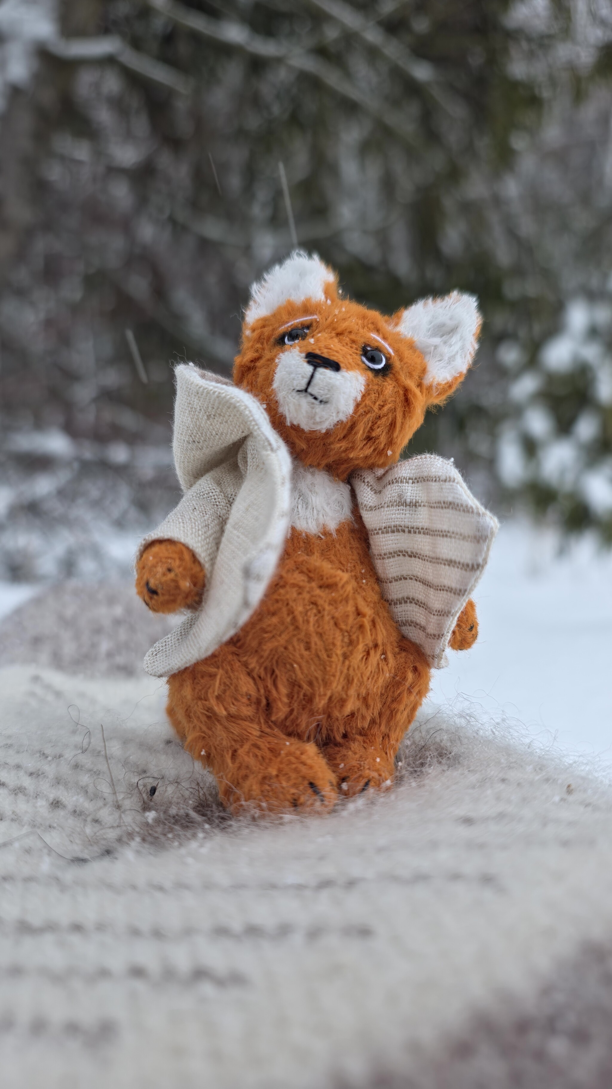 Жил да был маленький лисёнок. Он был не настоящий зверёк, а игрушка, аккуратно сшитая добрыми руками маленькой Алёнки: мягкий, рыжий, с грустными глазками-пуговками и белым кончиком на хвосте. На нём была тёплая курточка с большим капюшоном, который почти закрывал ушки от лесного ветра.