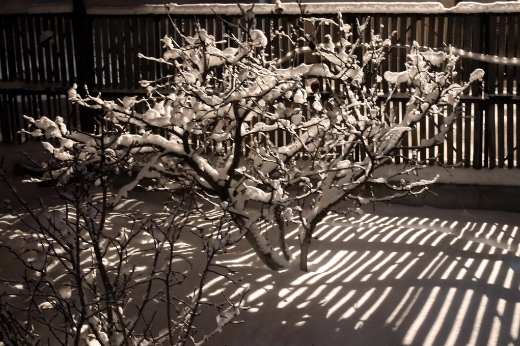 Растет в саду низкорослая яблоня. Дает неплохой урожай. Зимой, как и остальные деревья обычно стоит с голыми ветками. А на днях захожу в столовую ночью (да-да, "ночной дожор"), смотрю в окно, а там в свете от соседнего дома стоит эта яблонька, в снеговой наряд укутавшись.