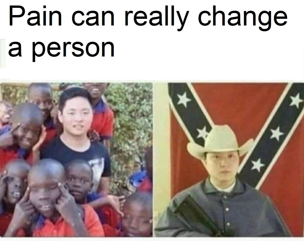 1640 Daniar7 Юмор для всех и каждого Злодеями не рождаются, злодеями становятся 27 дней назад Перевод: Боль реально может изменить человека. Странный юмор Юмор Картинка с текстом Конфедераты Азиаты Африканцы Расистский юмор Повтор 208 18 2 1 Ещё 0