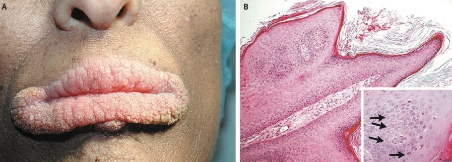 слизистой оболочки щек. На губах были обнаружены нитевидные папилломы в симметричном распределении (фото А). Язык был утолщен и покрыт морщинами. Была проведена биопсия, и гистологический анализ выявил акантоз и папилломатоз, гиперкератоз, повышенную пигментацию кожи и лимфогистиоцитарный инфильтрат кожи (фото В и вставка, стрелки). Эпидермальных включений обнаружено не было, а анализ ДНК вируса папилломы человека методом полимеразной цепной реакции не выявил ДНК вируса папилломы человека.