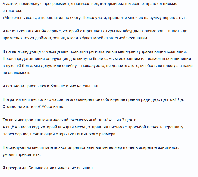 «Я не ожидаю, что вы примете наличные. Я ожидал, что мы оба посмеёмся над тем, насколько глупыми бывают компьютерные системы, и что вы просто спишете эти два цента, потому что обработка платежа обойдётся вам дороже».