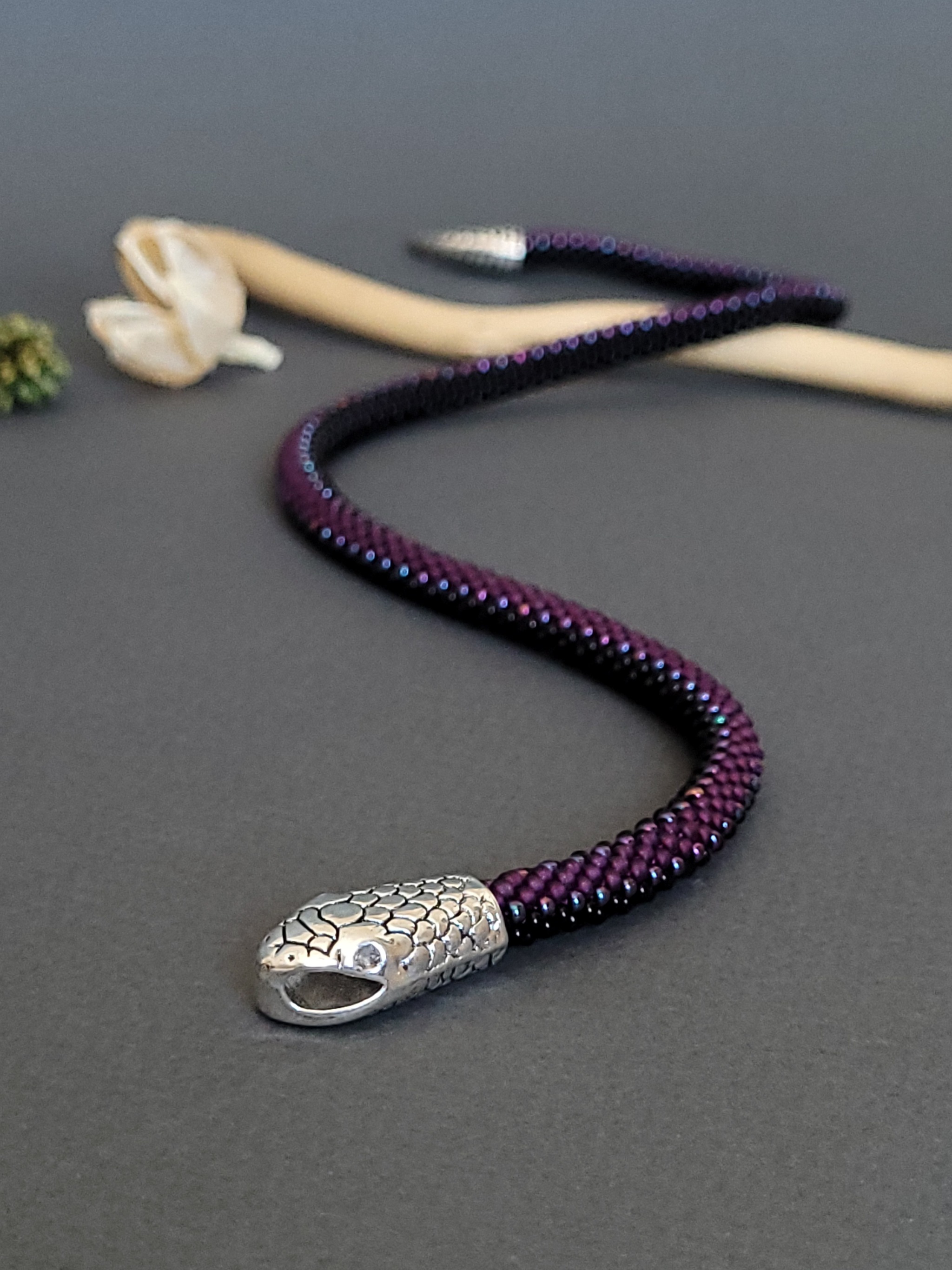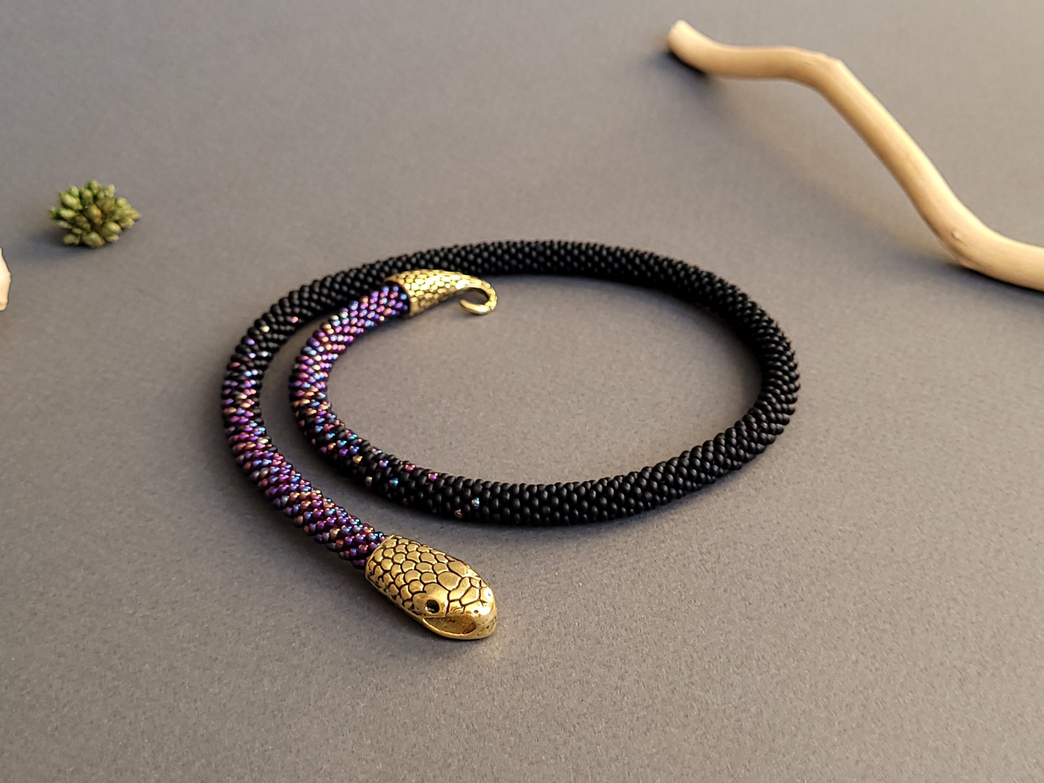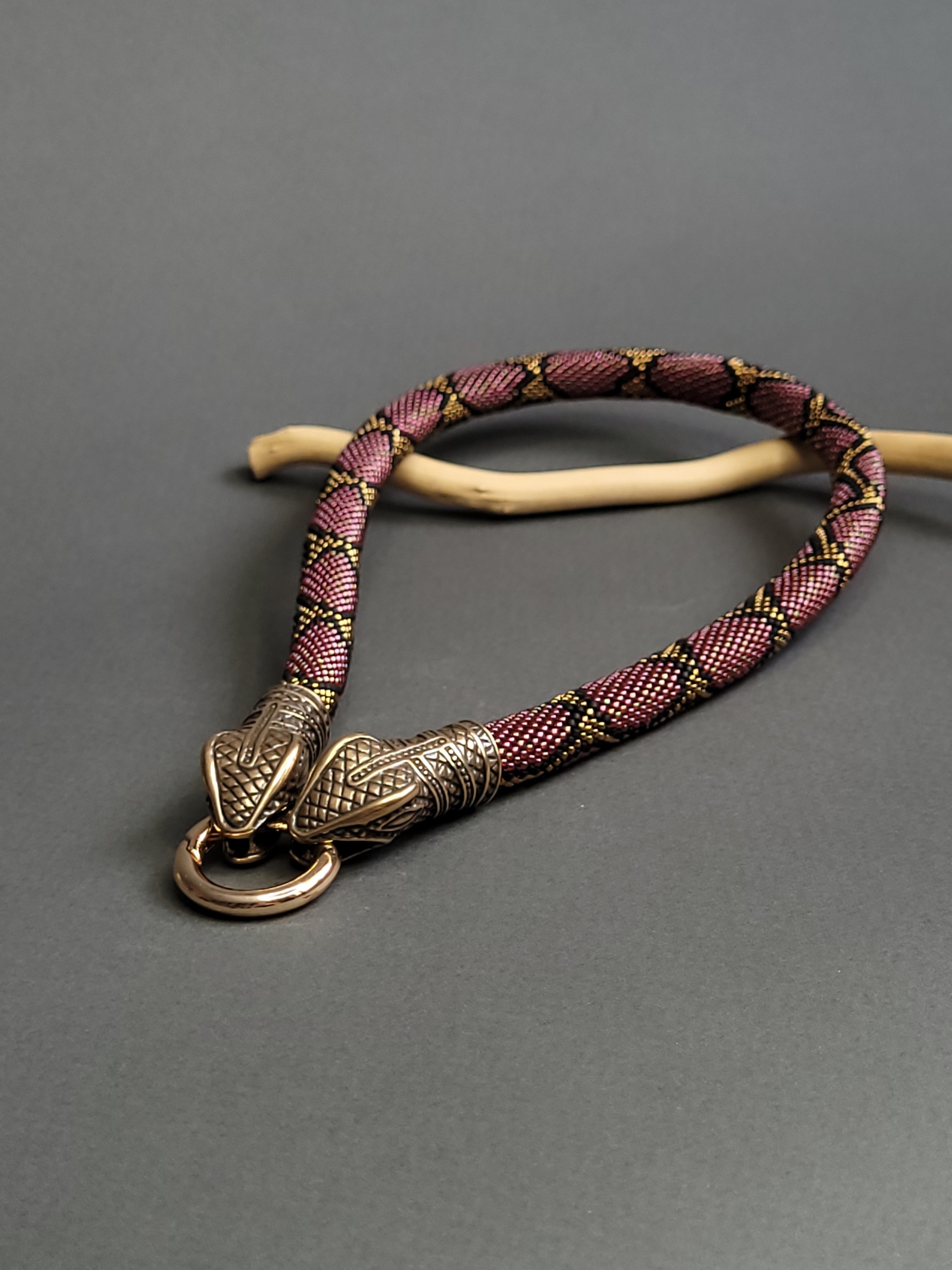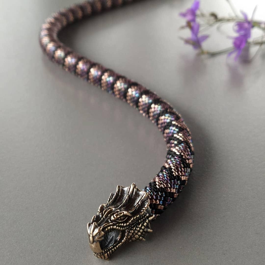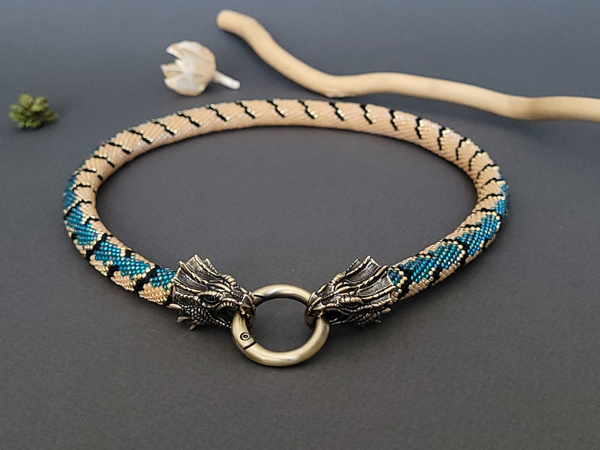 В последнее время я только и делаю змей, ну иногда еще и драконов с тиграми. Это колье вяжется столбиком крючком с бисером. Я использую армированную нить 70лл и бисер тохо 15/0.
