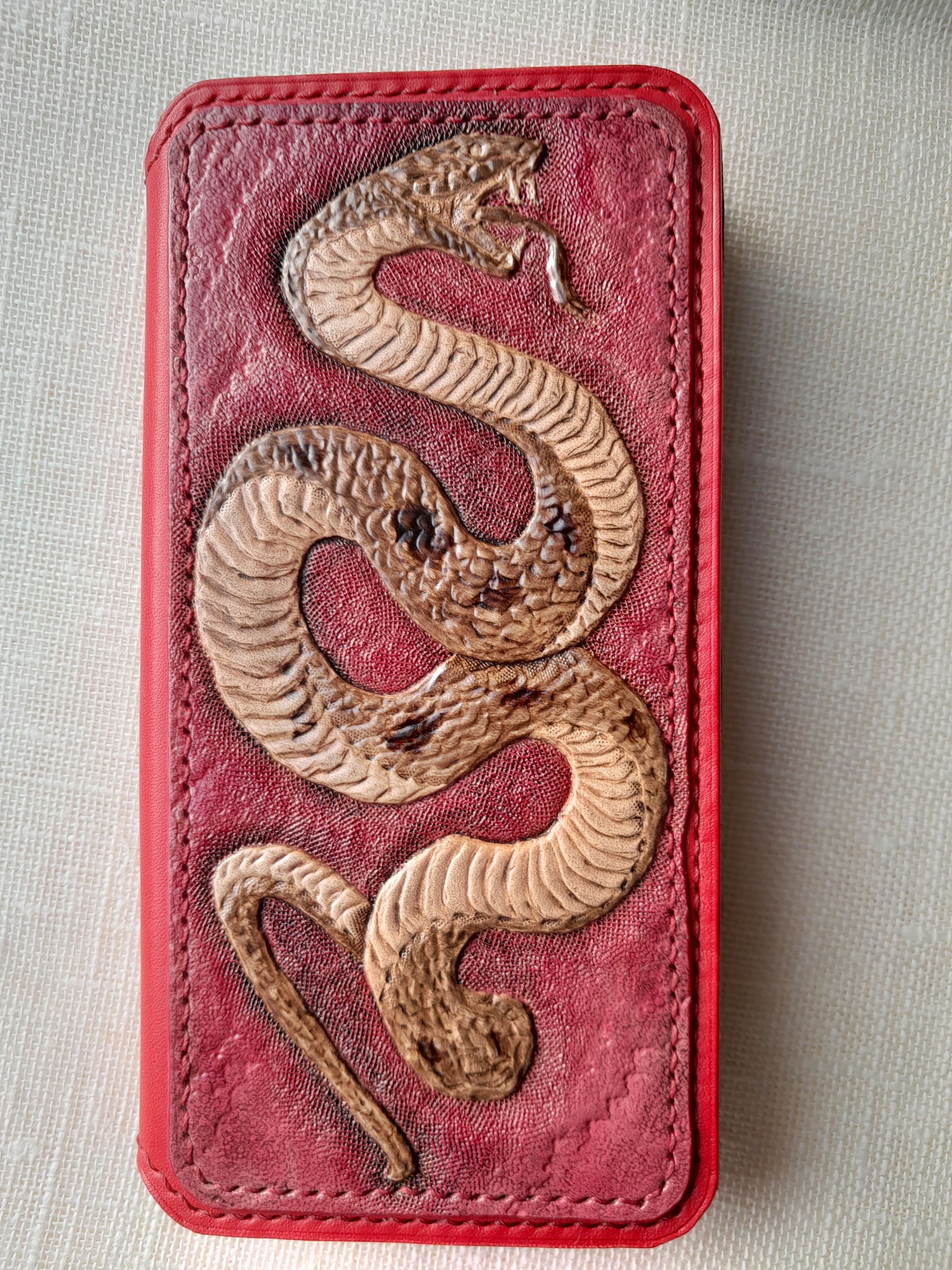 Для тиснения использовала кожу растительного дубления, краст неокрашенный в толщине 2 мм, основа из кожи растительного дубления красного цвета в толщине 1,2 мм, на подкладке кожа телёнка галантерейная чёрного цвета. Пробойники ромбы строчные с шагом 4 мм, нитки СТР плетеные 0,4 мм.