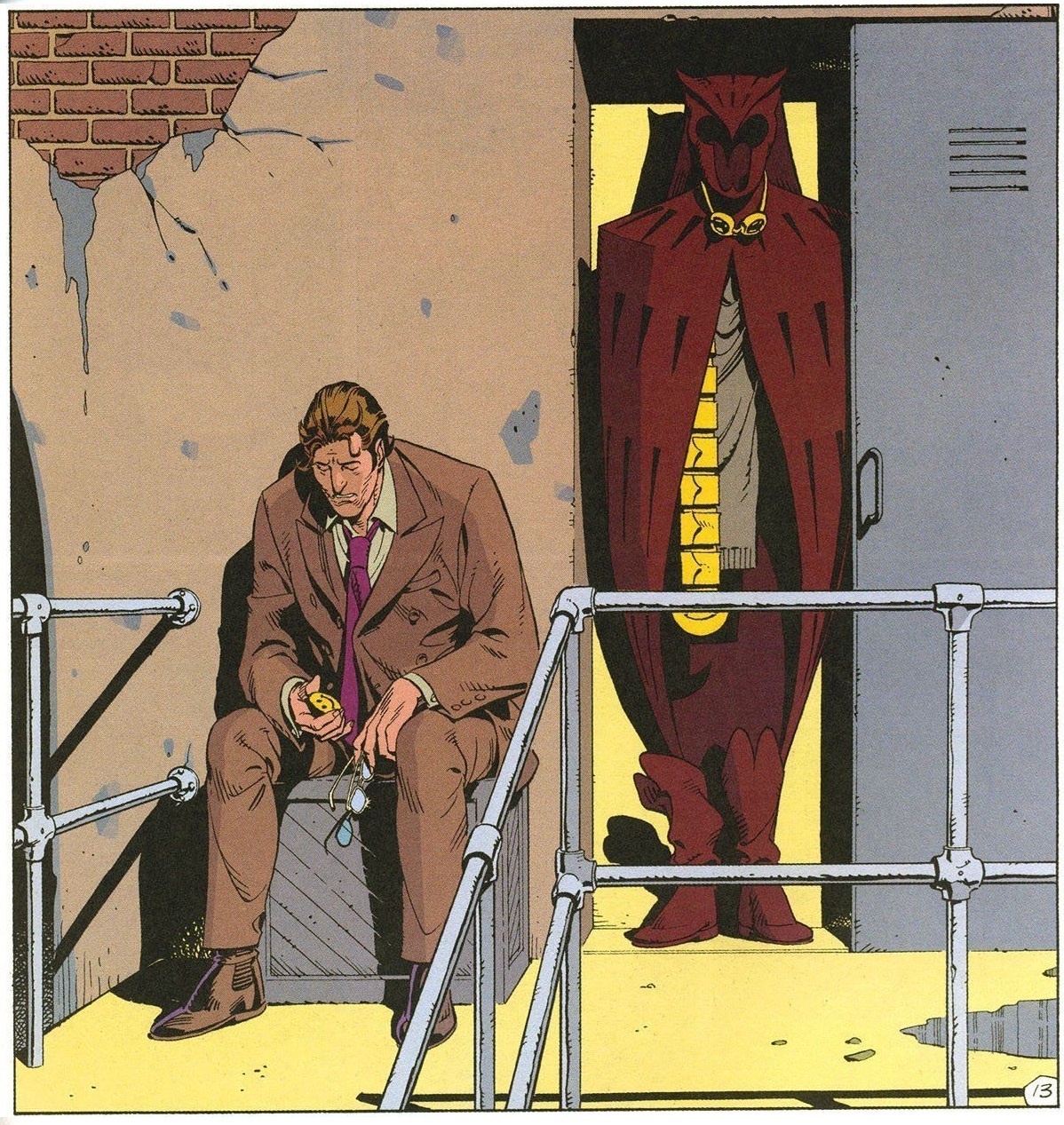 Новым хозяином становиться «Ночная Сова». Роршах отдает ему окровавленный смайлик, как доказательство, что за прошлыми костюмированными героями идет охота. На похоронах Комедианта Дэниэл бросает значок в могилу, отдавая последнюю честь Блейку.