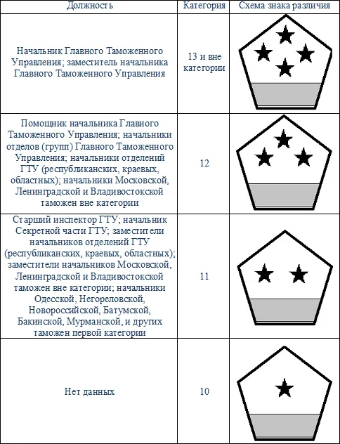 С 1934 по 1951 год таможенники носили форменную одежду с нарукавными знаками отличия. К примеру, для лиц высшего начальствующего состава (вне категории, 13-й, 12-й, 11-й, 10-й категорий — начальники таможен первой и второй категорий, инспекторы ГТУ, старшие инспекторы (начальники групп) отделений ГТУ и т.д. — широкий (размером 2,8 см) галун и металлическая звездочка диаметром 1 см.