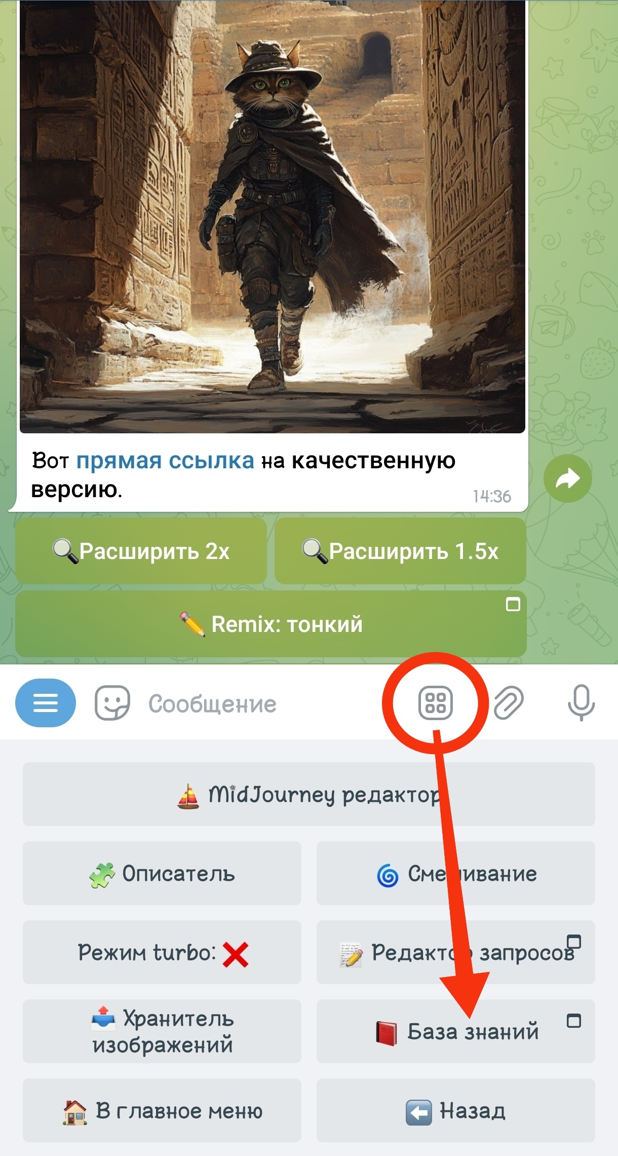 Далее в нашем чате нажимаем на кнопку скрепки 📎 и выбираем нужную картинку для создания на основе неё промпта;