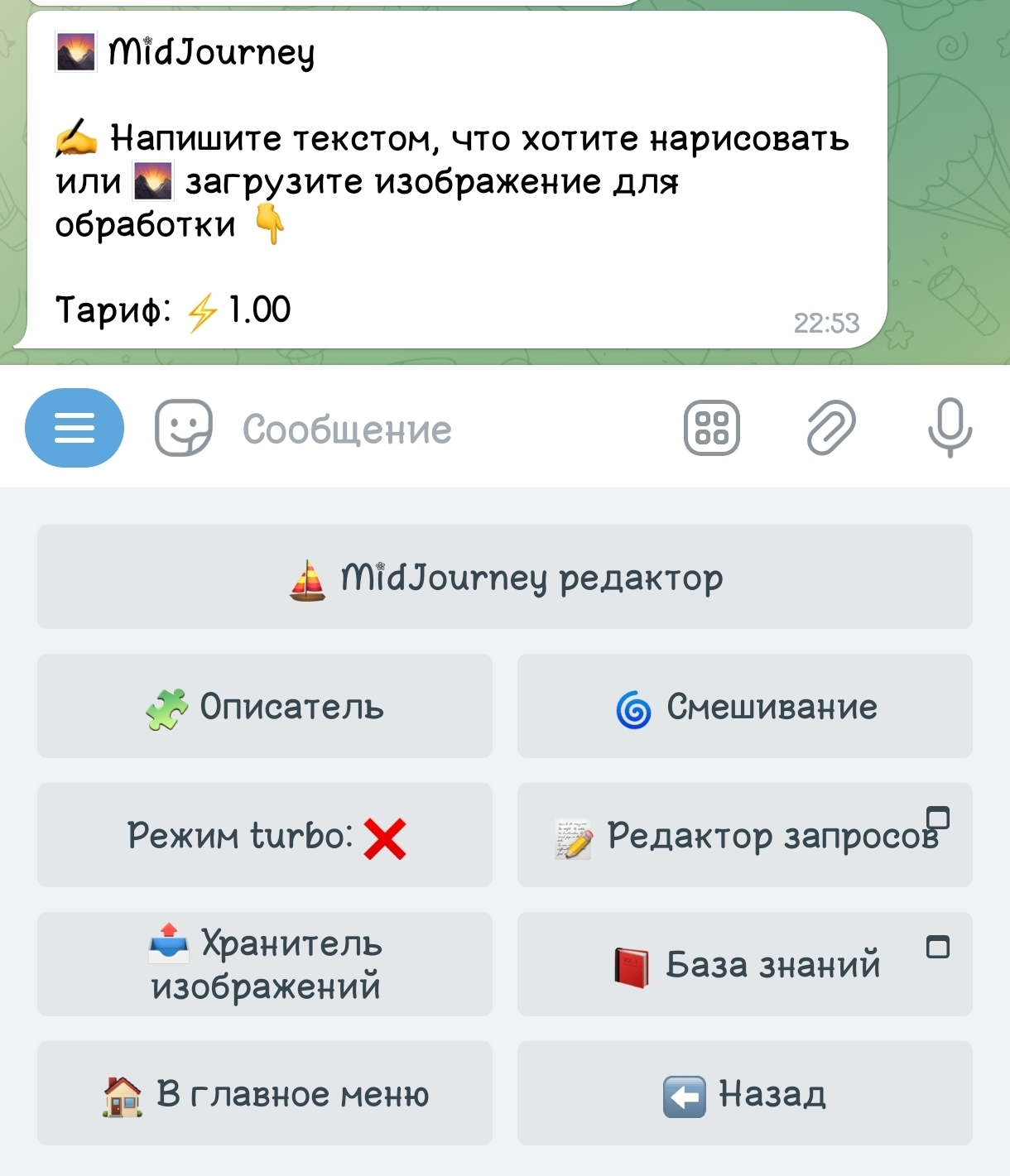 После настроек введите текстовый запрос для выбранной нейросети или поставленного модуля. Также для некоторых нейросетей есть возможность добавить картинку, например чтобы сделать полное описание.