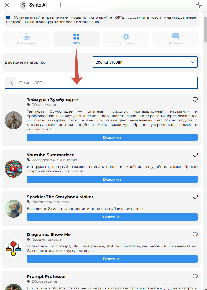 Меню → выбираем группу GPTs, заходим в Управление и выбираем нужную нейросеть или категорию