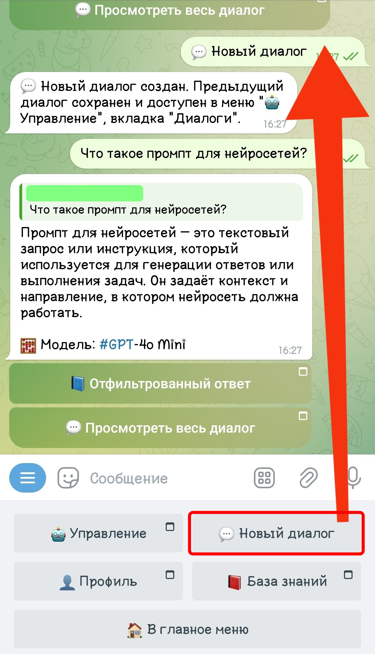 Если вы хотите начать новую генерацию или сделать новый запрос, например в нейросеть GPT-4o Mini, то откройте дополнительное меню и нажмите на кнопку Новый диалог (не забудьте выбрать в Управлении нужную нейросеть).