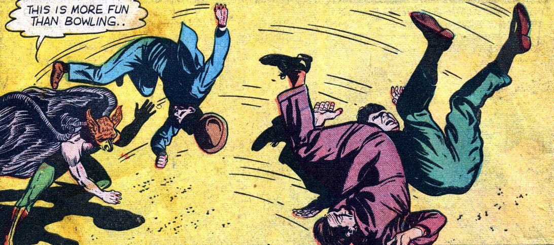 Услышав, что редактор крупной газеты собирается заплатить хорошую сумму денег тому, кто остановит бандитов, нападающих на грузовики с тиражом и избивающих разносчиков, Хоукмэн берётся за дело. С рядовыми бандитами он справляется с помощью своих пудовых кулаков, крепких крыльев на поясе из Эн-металла и строительной техники – и выбивает из бандитов имя их главаря. Оказывается, направляет бандитов на газету некто Когг – американский немец, которого не радует, что газеты поднимают мораль американского народа. Получив по голове, Когг сдаётся, а Хоукмэн получает нужную сумму. Впереди – приключения Песочного Человека, носителя одного из самых классных костюмов среди всех героев Золотого Века.