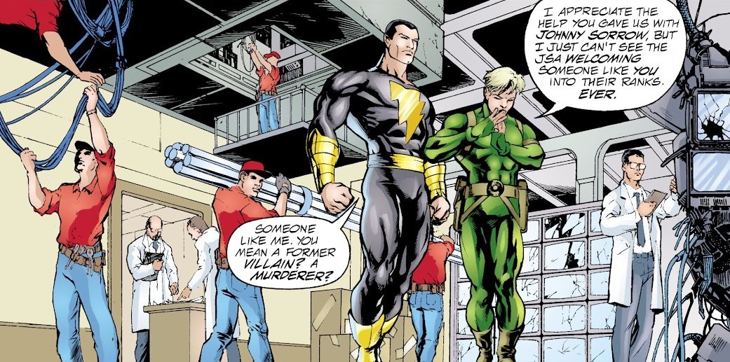 Любителям сплошного экшона - в другие посты, в этом выпуске будет преимущественно трёп - но и совсем без него всё же нельзя. Комикс начинается с ошеломляющей новости – Чёрный Адам намерен присоединиться к Обществу Справедливости. И тут назревает проблема – с одной стороны, отказать ему неудобно – он изрядно помог Обществу в битве с Джонни Сорроу и Королём Слёз (тварью, будто сошедшей со страниц какой-нибудь потерянной книги Лавкрафта). С другой стороны, принять его в Общество – тот ещё зашквар, ведь Адам – известный суперзлодей. С третьей стороны, он вроде и неуиноуат, ведь его руками злодействовал взявший его под контроль человек, преступник Тео Адам, а сам Чёрный Адам – суровый, но справедливый.