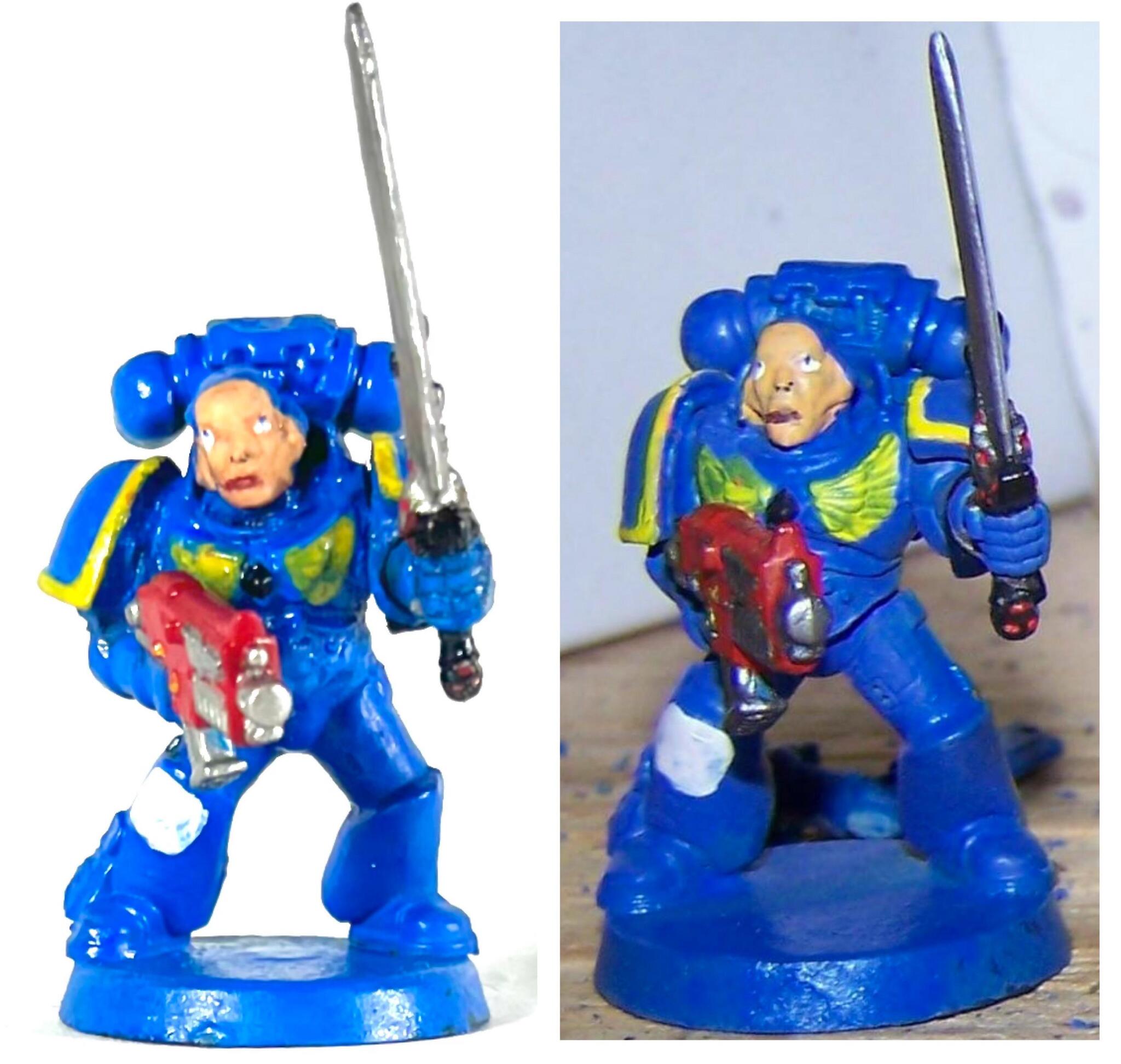 Чтобы был понятен последний этап - прикрепляю фото из интернета, показывающие качественный и некачественный покрас миниатюрок 5 см из WH40k.