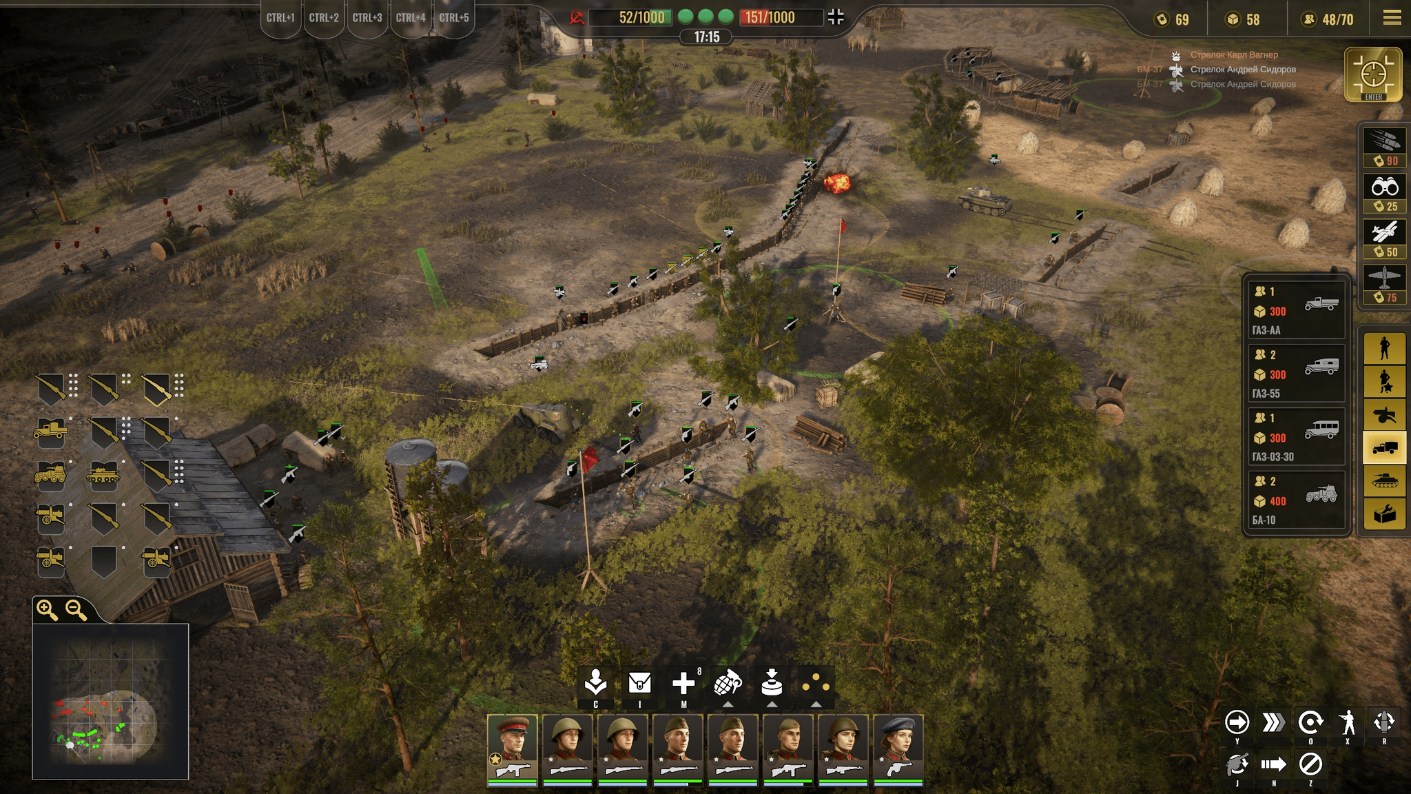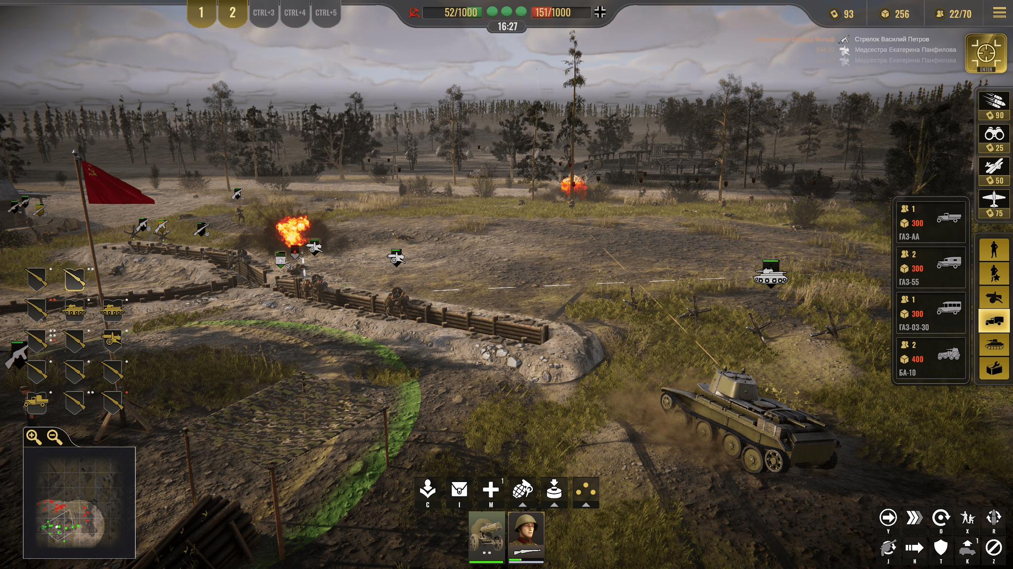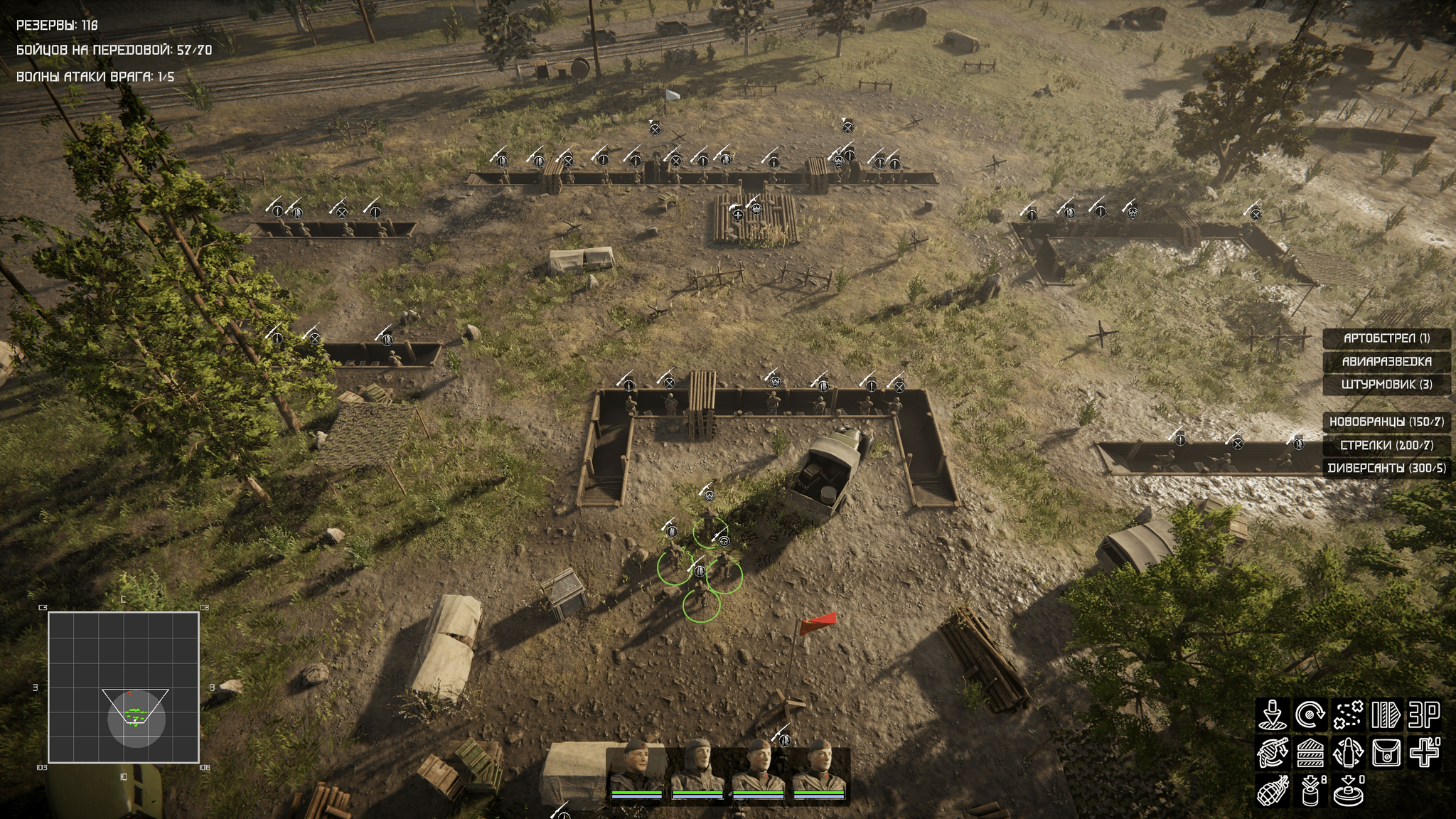 Здесь вы отдаете приказы: разведка снимает туман войны с выбранных участков карты, артиллерия и авиация прочищают путь наступающим отрядам. Каждый вызов требует ресурсов и времени на перезарядку.