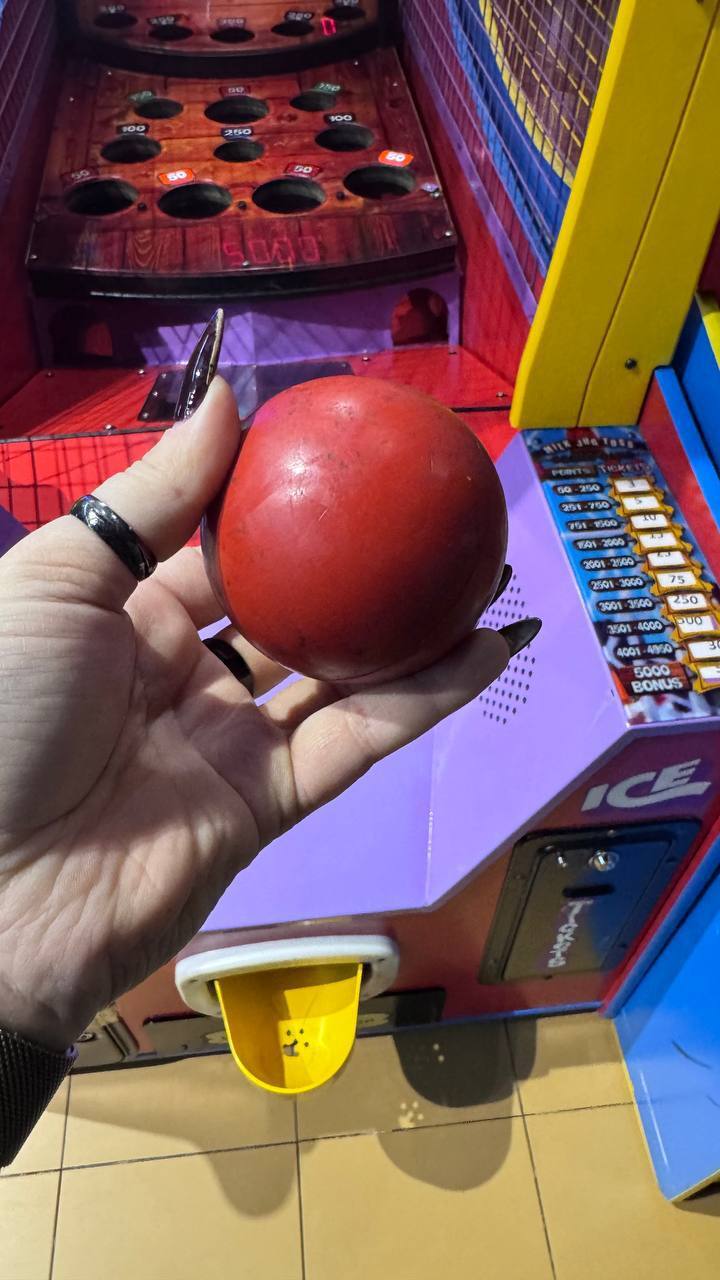 Есть игровой автомат, предположительно называется Milk Jug Toss. Для него нужны шары (фото приложу). Диаметр шара — примерно 72–75 мм.