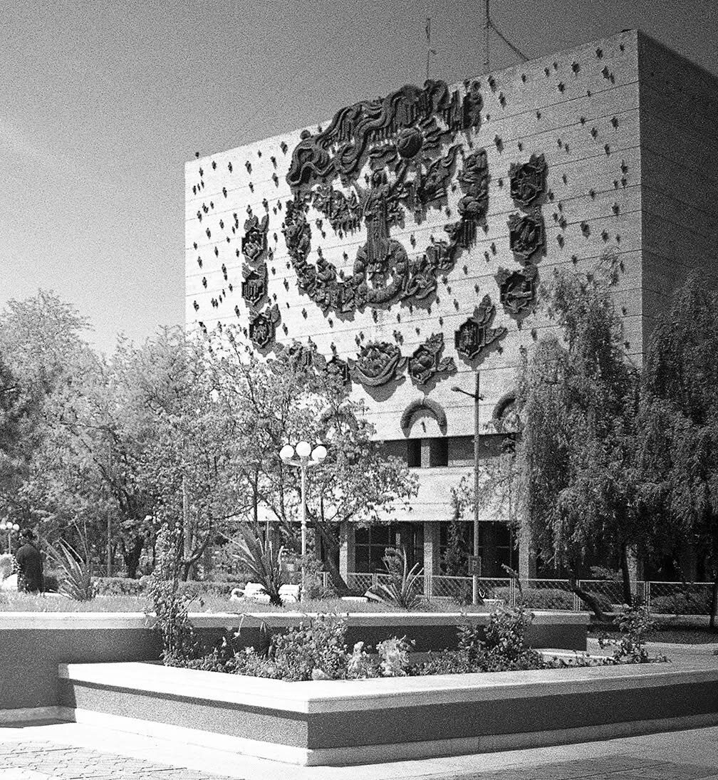 Это здание Международного телеграфа в городе Ашхабаде. Только сегодня узнал, что вот это вот всё на фасаде принадлежит перу Зураба Церетели (светлая память).