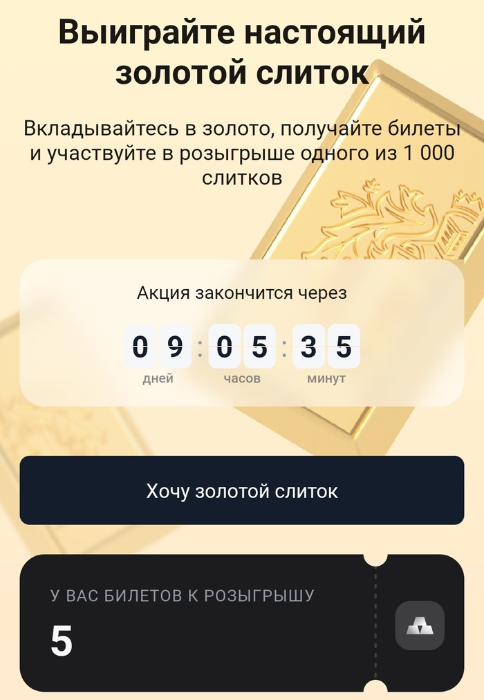 Конкурс от Тинькофф (до 19 августа). Брокер разыгрывает золотые слитки, нужно всего лишь купить компанию связанную с золотом, фонд на золото, фьючерсы или физическое золото. Что-то из этого или все вместе. Всего 1000 золотых слитков будет разыграно. Покупаете на 1000 рублей – получаете 1 билет. Чем больше купили, тем больше билетов получили, тем выше ваши шансы на победу.