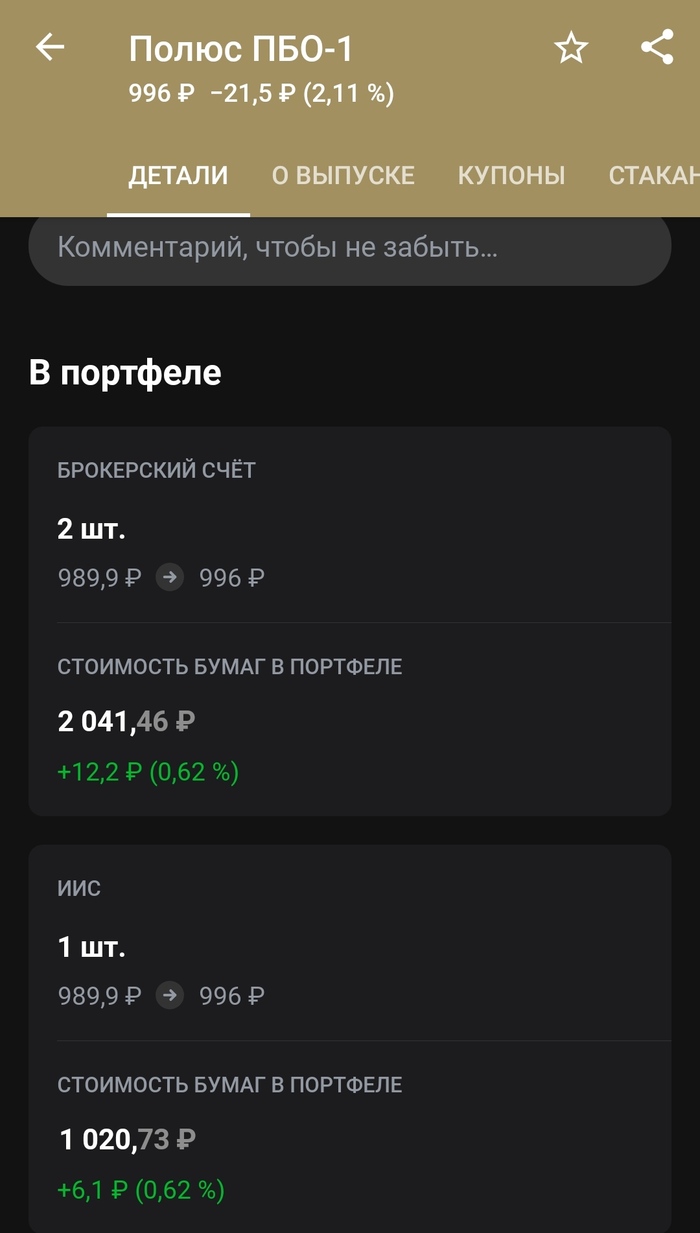 🍏Облигации Полюс ПБО-1. Купил 3 шт, уже есть небольшой рост. Срок 2 года 2 месяца. Рейтинг компании высокий. Выплата каждые полгода. Ближайший купон будет после 10 октября. Зачем купил? Во-первых в моем портфеле очень мало облигаций, понемногу стараюсь повышать их долю. Во-вторых, это надежно. Шанс потерять здесь свои деньги стремится к нулю, но и заработать много не получится. Примерно можно получить 1600 рублей, если вложить 10 тыс рублей, и все это за 2 года.