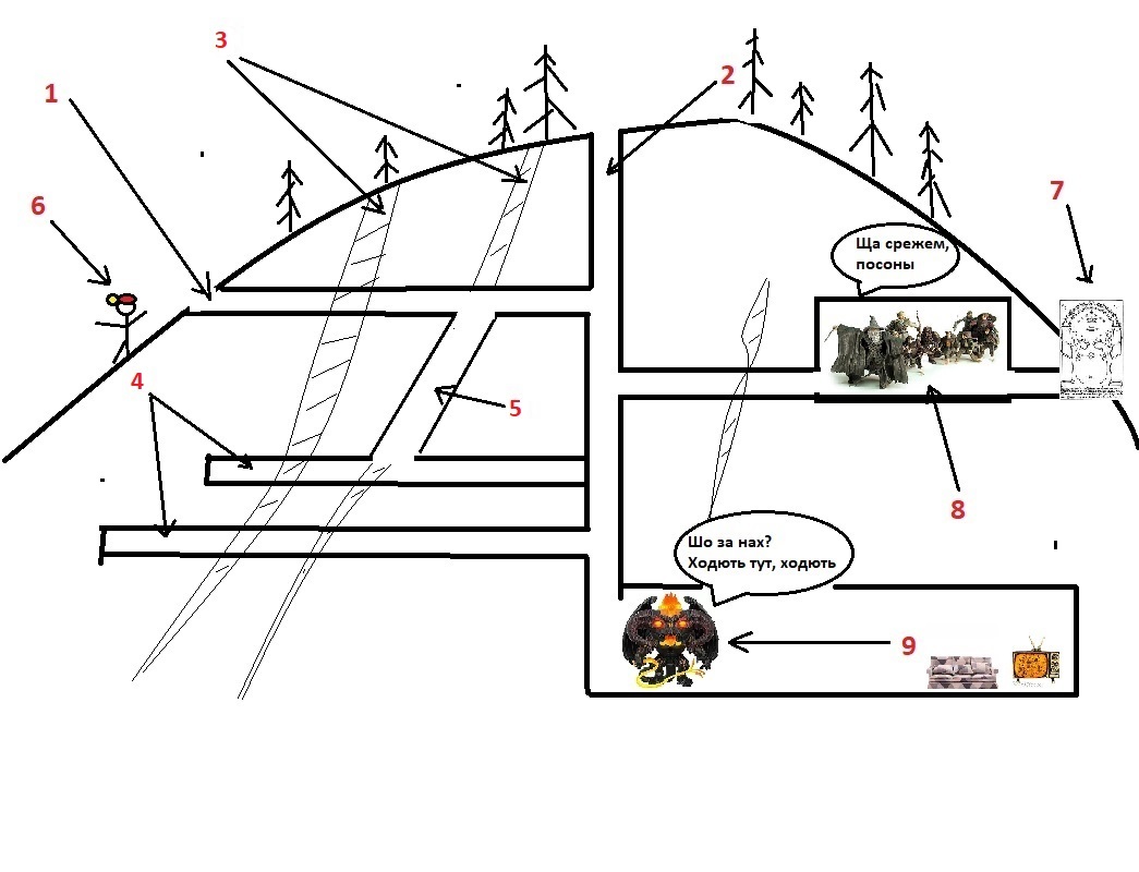 Цифрами обозначены: 1 - штольня; 2 - шахтный ствол; 3 - рудные тела, они же жилы; 4 - штреки; 5 - камера или блок, отработанный по рудному телу; 6 - я с фонарём на голове (судя по направлению движения вниз по склону горы, я уже иду домой, и вовремя, т.к.: уже через 7 - Врата Мории вошли 8 - Гэндальф со товарищи и разбудили 9 - Балрога).