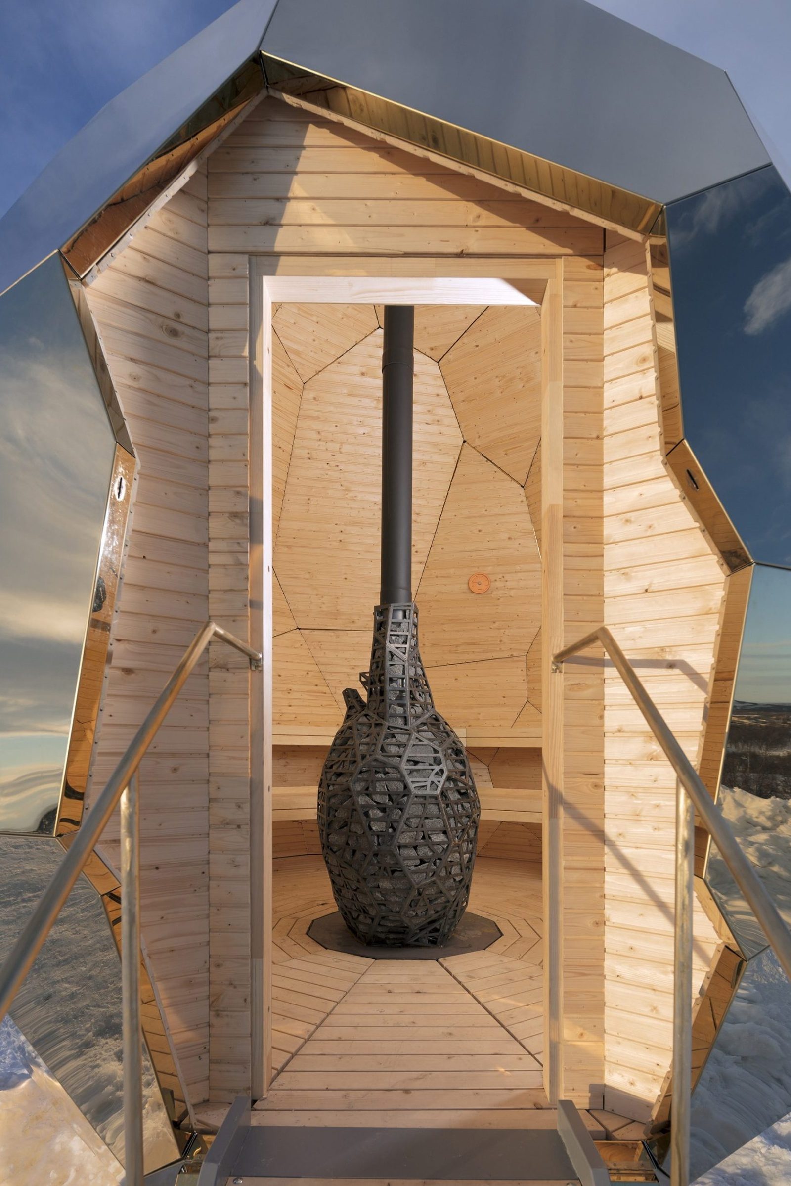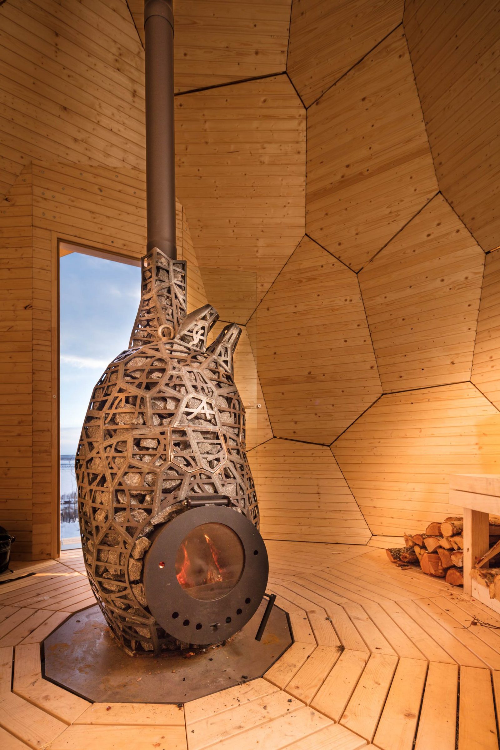 Форма яйца символизирует инкубатор, в котором рождаются и развиваются идеи, а сауна не только собирает людей как общественное пространство, но и оказывается самой уместной постройкой в лапландских снегах. У архитекторов получилось создать многоуровневую идею, где форма и содержание вызывают целую цепь ассоциаций, однако все они так или иначе связаны с благополучием Кируны и ее жителей. Железная печь в центре сауны выполнена в форме человеческого сердца — еще один символ единения и своего рода отличительный знак пространства, в котором решается вопрос жизни города.