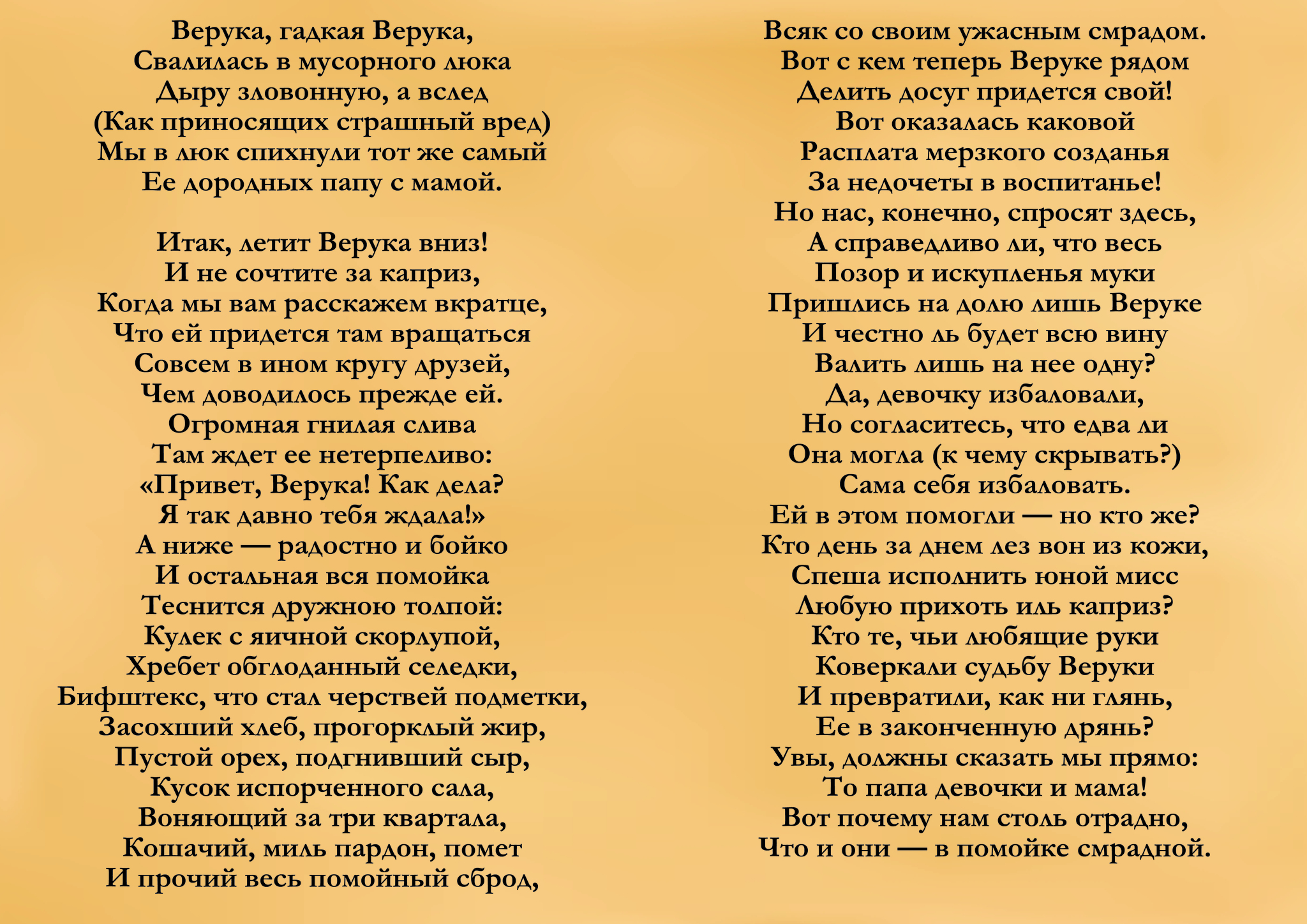 Сотня белок обездвижили её, а одна начала простукивать. Разумеется, нужного звука не было, и, приняв её за гнилой орех (и с её гнилой натурой они не ошиблись), белки оттащили её в мусоропровод.