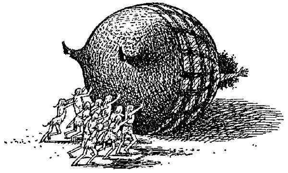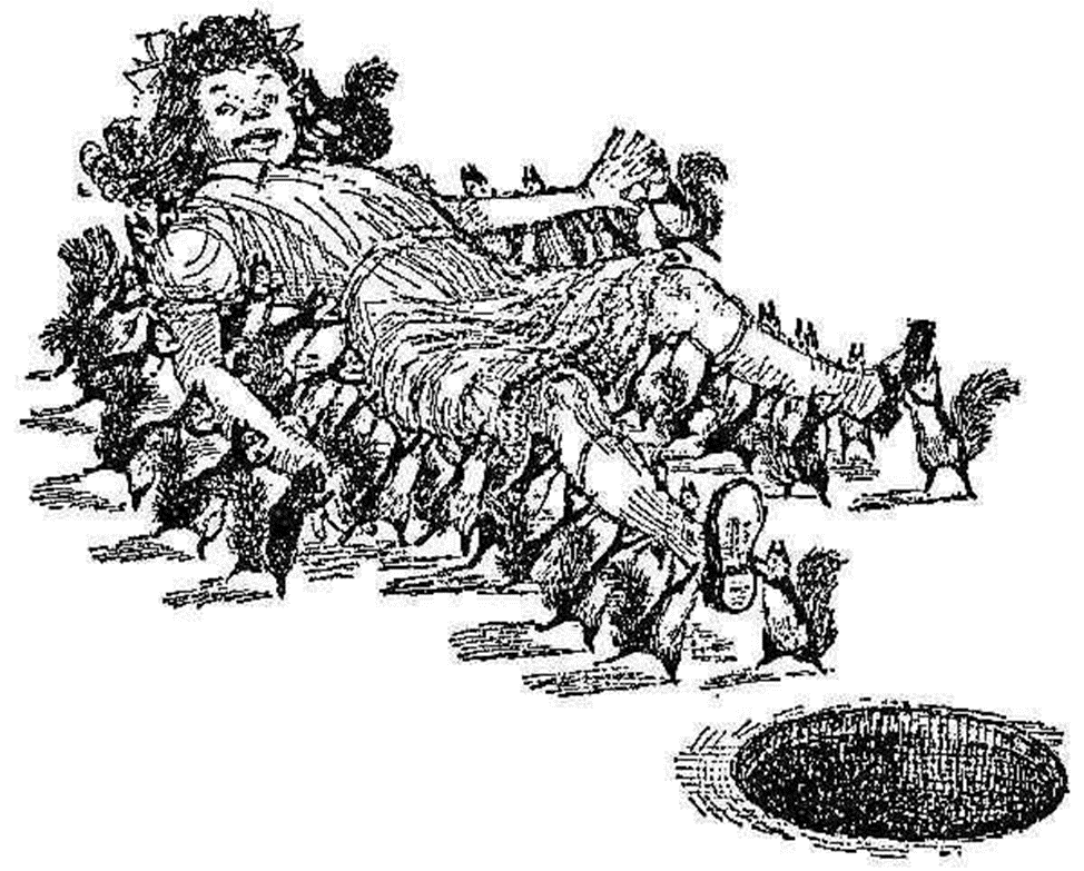 «Крошечные человечки — каждый из них был не больше среднего размера куклы — оторвались от работы и, в свою очередь, уставились через реку на непрошеных визитеров. Один из человечков указал пальцем на детей, прошептал что-то остальным четырем и все пятеро разразились громким смехом.