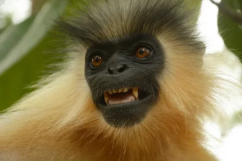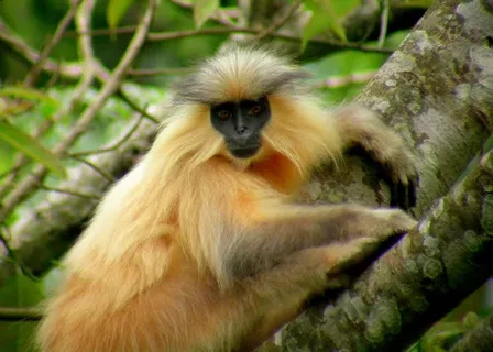 Золотой лангур, или трахипитек Гее - Trachypithecus geei - относится к листовым обезьянам. Масса тела самцов и самок 8,5 кг. Окрас шерсти варьирует от золотистого и кремово-белого до каштанового, причем, цвет меняется в зависимости от сезона. Детеныши рождаются с шерстью нежно-абрикосового цвета. Золотой лангур обитает в Бутане и Индии. Населяет вечнозеленые тропические леса. По лесу передвигается на четырех конечностях. Ведет дневной образ жизни. Спит на больших деревьях или в пещерах.