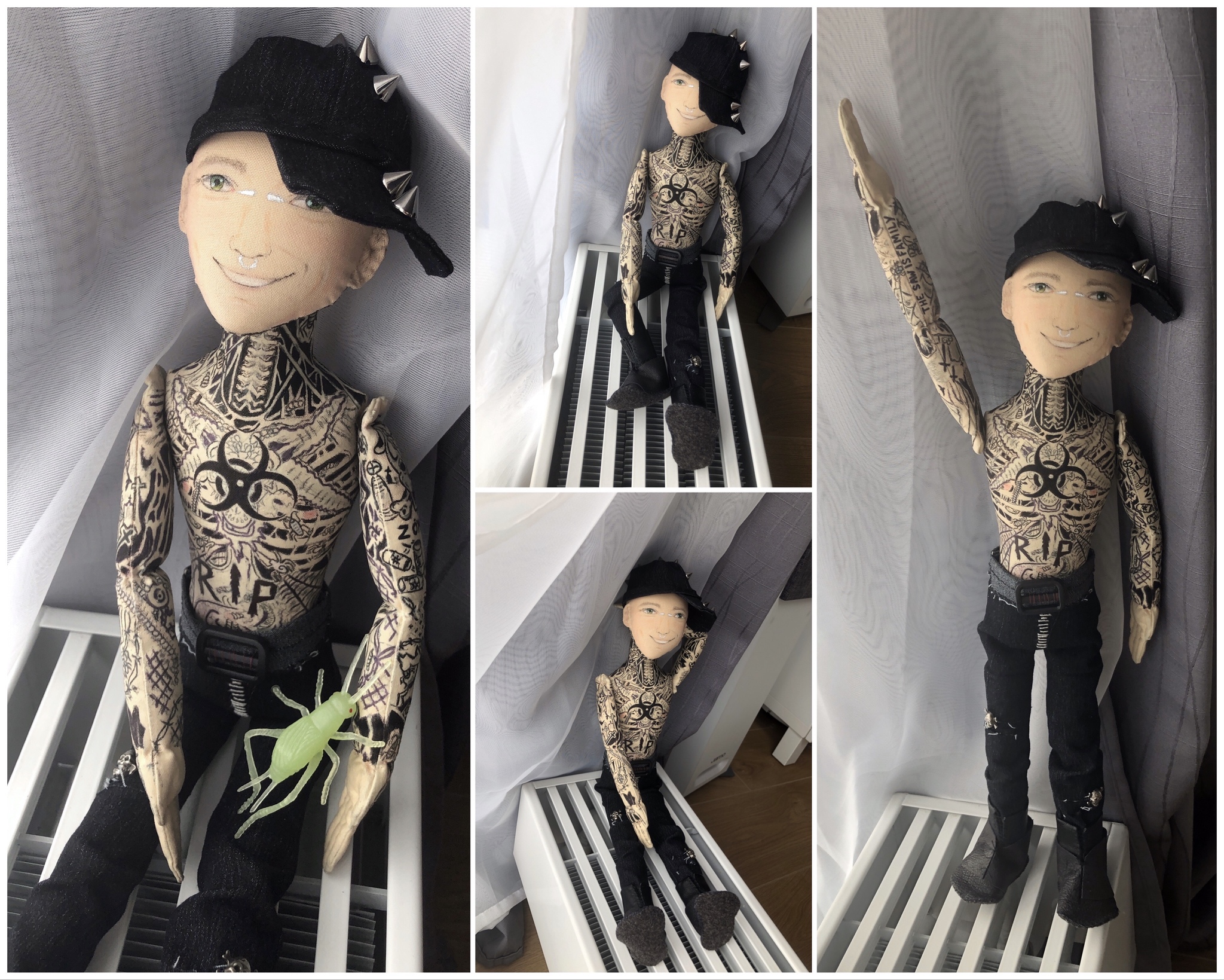 Рост 41 см, из 100% хлопка, наполнитель - синтепух. Рисунки закреплены фиксативом.