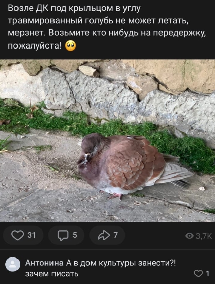 62 BapuaHToBHeT Зоошиза. Новый уровень 1 год назад Наткнулся во ВК в одном из пабликов одного населенного пункта. Дальше - крысы из помоек? Радикальная зоозащита Голубь 11 5 1 Ещё 0
