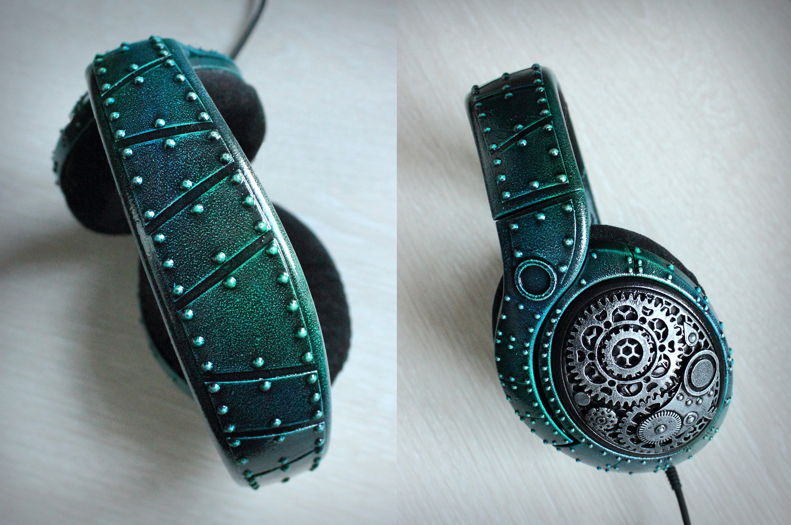 Итак, за основу этого проекта были взяты б/у Sennheiser HD558, повидавшие виды, но ещё в хорошем состоянии. Работал в этот раз по бартеру на материалы, редчайший случай) Заказчик просил что-нибудь стимпанковское, но не в бронзовых, а в сине-зеленых тонах. Наподобие одной из моих мышей - "Кракена". Его я делал из Oklick 795G, в рамках рукодельного флешмоба для ярмарки "ArtFlection". К моему удивлению, его обладателем стал мальчишка лет 12. Он ещё дважды с блеском в глазах возвращался к моему стенду убедиться, что эта мышь действительно единственная в мире и такой больше ни у кого нет) А восторг покупателей очень сильно вдохновляет.