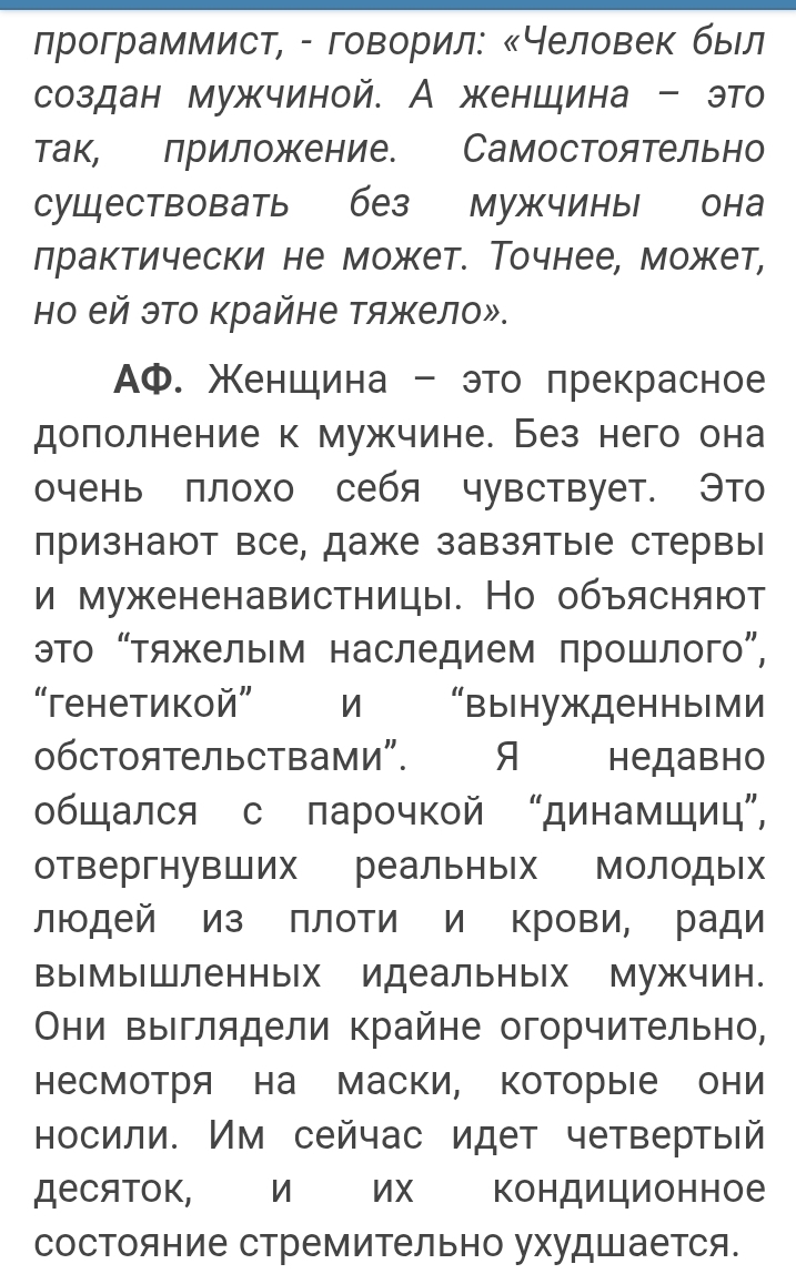 4 Tristaniizolda Зовите феминисток, у меня полыхает 10 месяцев назад Читала интервью с одним современным писателем, наткнулась на прекрасное. Мужчины и женщины Антифеминизм Интервью Писатели 4 2 1 Ещё 0