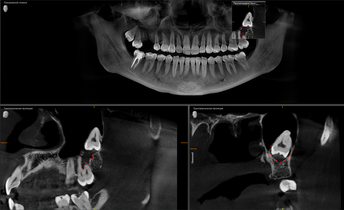 Красным пунктиром отмечено разрастание фолликулярной кисты, которая распространилась в область корней зуба по соседству.