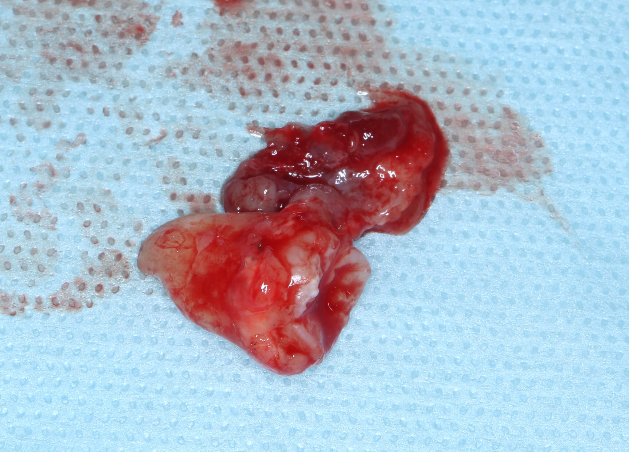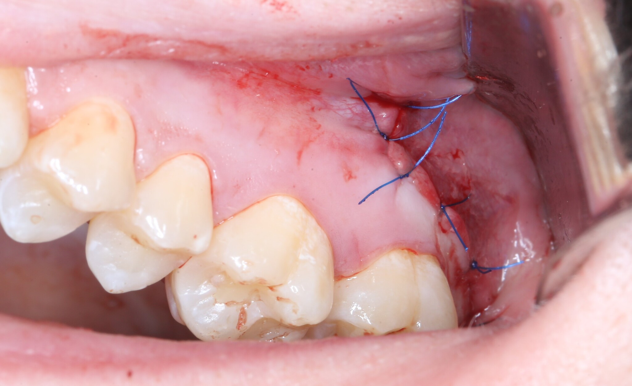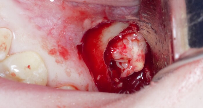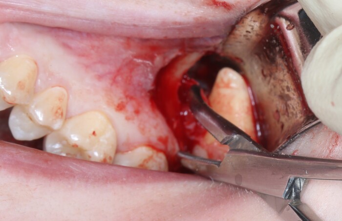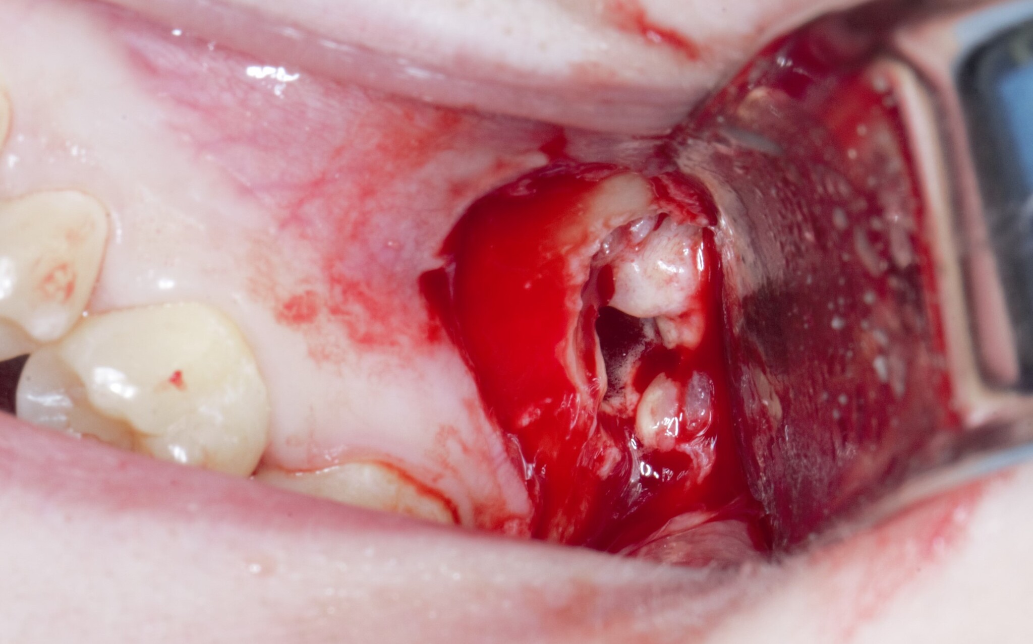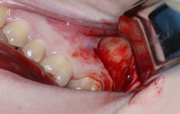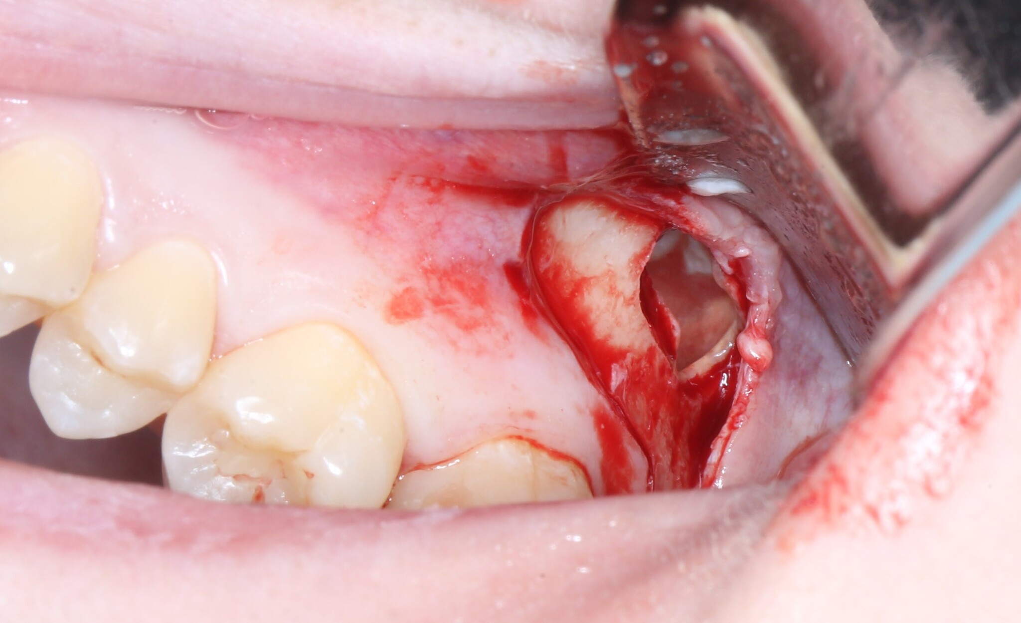 Я сделал анестезию, разрез и отслоил слизисто-надкостнечный лоскут:
