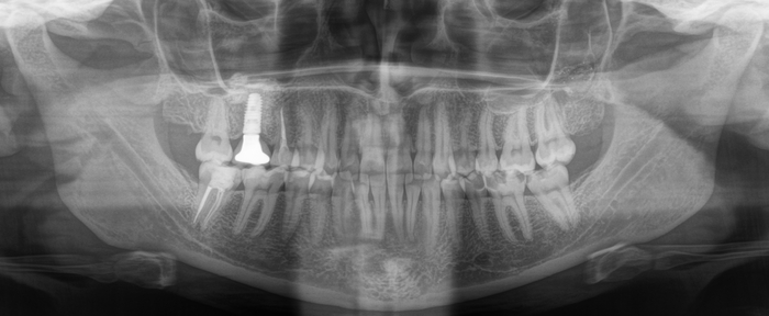 В целом, каких-то явных изменений нет. В подтверждение тому, что это не один и тот же снимок, вы можете обратить внимание, что на имплантате уже установлена постоянная коронка.